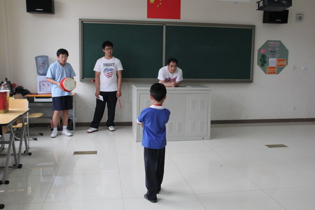 用餐结束后我们便去了教学楼内休息。大概过了10几分钟,老师来给我们讲了这次活动的内容及安排。这次活动有四个项目,分别是盲人击鼓,英语单词造句,英语单词表演及拍球答题。赵佳杰同学为这次活动做了充分的准备,做了英语单词造句用的卡片及表演的卡片。之后便进行了分组,第一个游戏是由黄林生同学及盲人学校的同学和美国三名交流生负责,第二个游戏是由盲人学校的和2个外国交流生负责,第三个游戏由赵佳杰,张研义及盲人学校的学生和1个外国交流生负责,第四个游戏则是江玉婷及盲人学校的同学和1个外国交流生。最后是窦心怡,江雨婷,赵文冬,赵文珍完成发奖的工作。