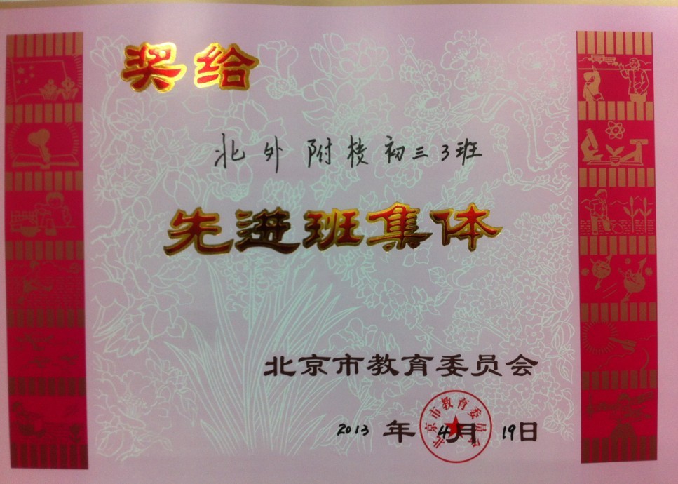 初三(3)班荣获“北京市先进班集体”称号。