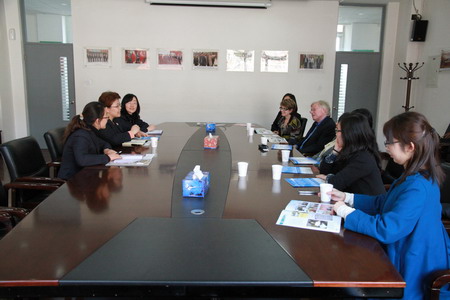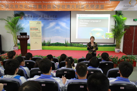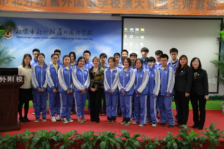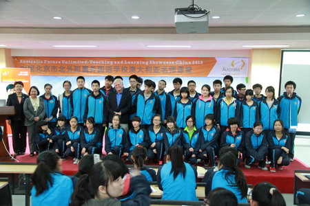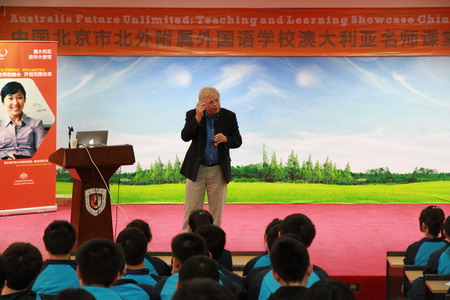 活动开始前,常务副校长王彤博士在209会议室接见了来自澳大利亚西悉尼大学的Roy Tasker教授(该教授因其生动启发性的教学方式获得“2011年澳大利亚大学年度优秀教师总理奖”)和莫纳什大学教授Keryn Chalmers以及澳贸委教育专员、澳大利亚驻上海总领事馆教育领事徐佩仪(Eliza Chui)女士一行。王校长向来宾介绍了我校的办学特色以及高中教育教学情况,来宾对我校的“复语复合型”办学目标表现出浓厚兴趣,并表示,此次在中国巡讲,会在广州、成都、温岭、北京等城市的多所具有外语办学特色的学校进行现场实景授课,北外附校是他们在北京市遴选的二所学校之一,此行目的是“希望通过澳大利亚名师课堂这样的‘体验’方式让更多的中国学生了解澳大利亚的优质教育和创新的教学模式”。未来,澳方来宾希望可以与我校保持长期合作关系,让更多北外附校的学生去澳大利亚留学。