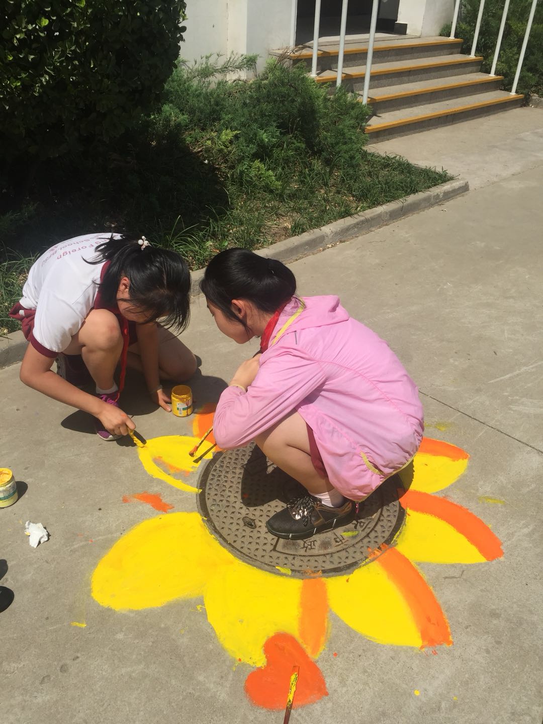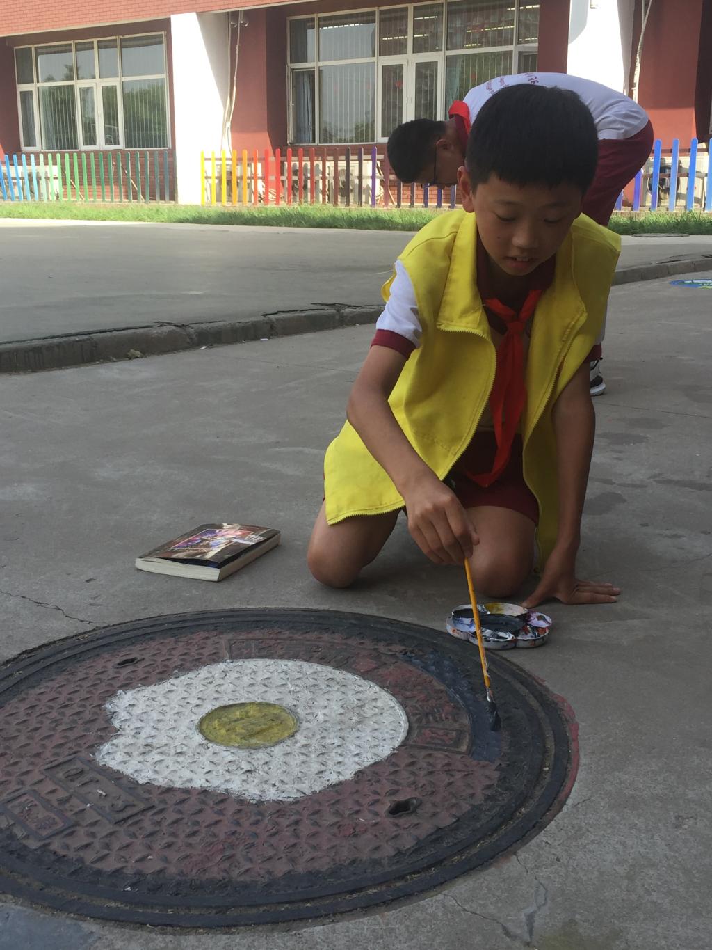 同学们在绘画井盖时,或蹲、或趴、或跪,每个人都为美化校园环境贡献自己的一份力量。