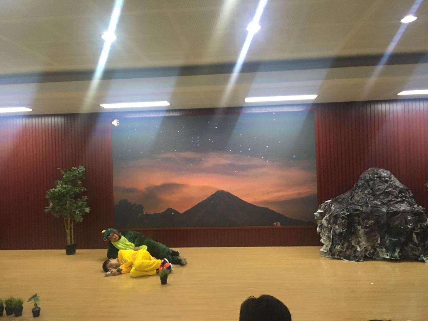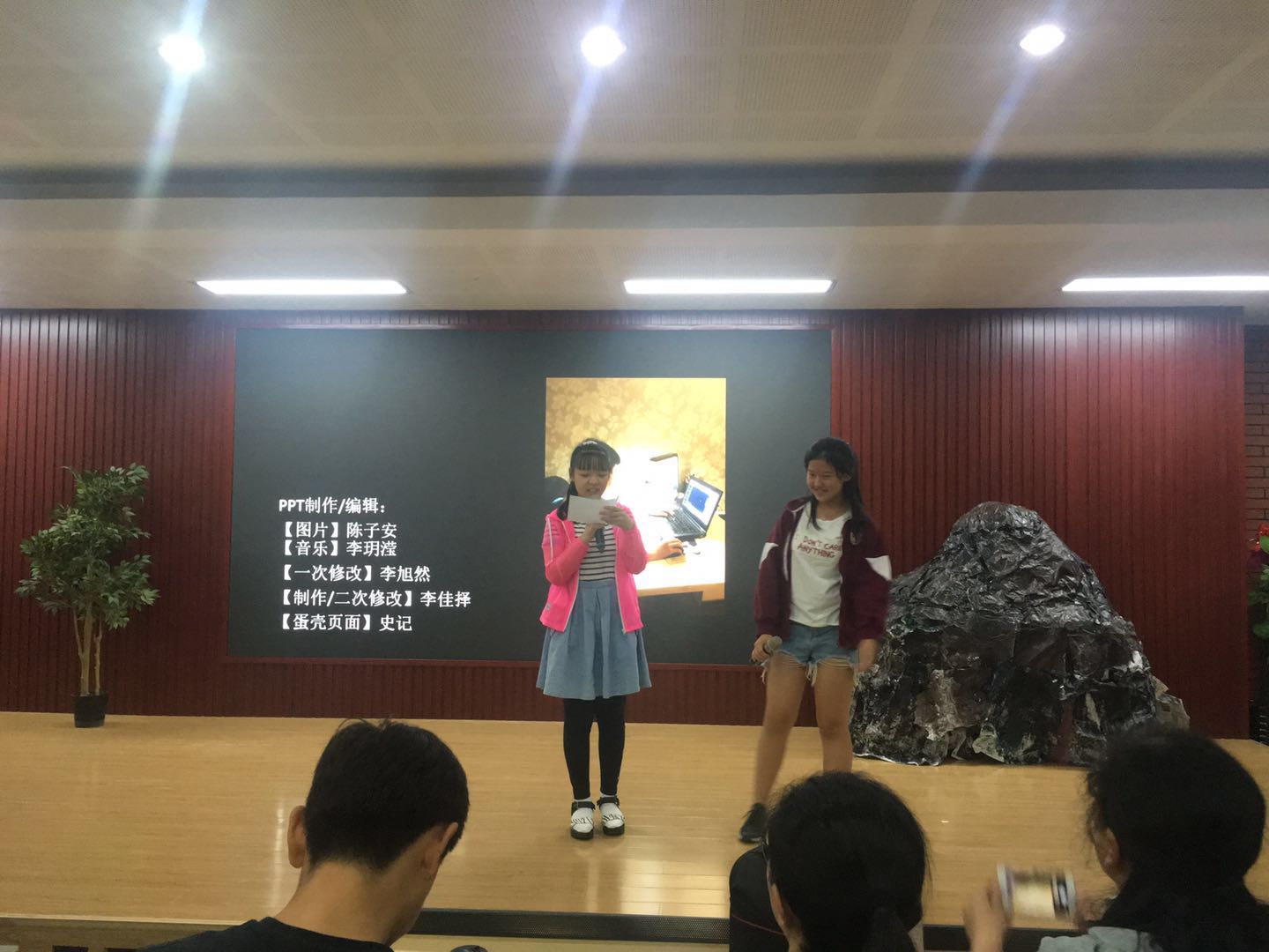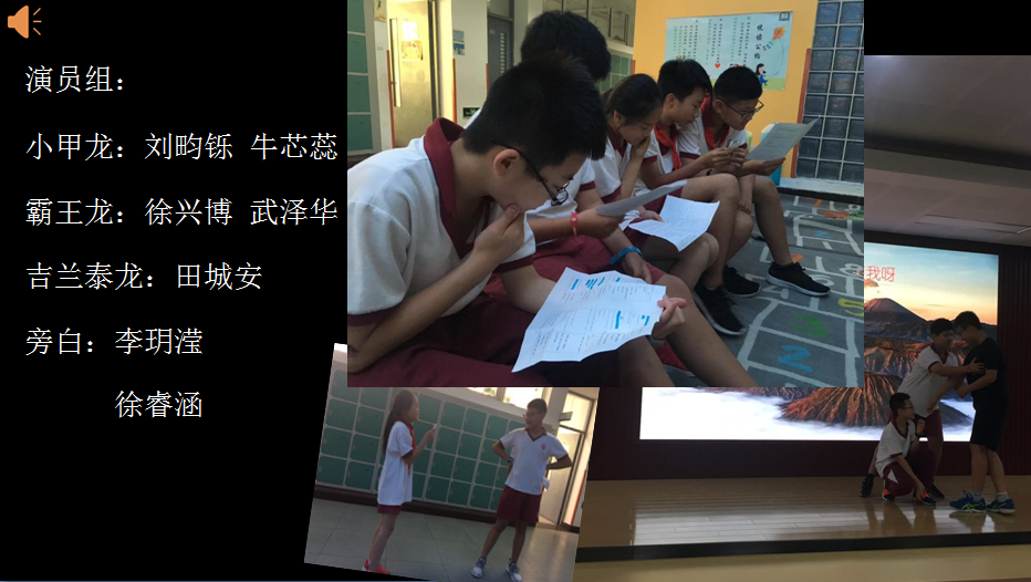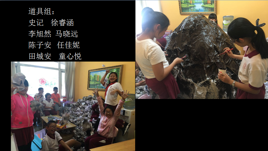 同学们在剧组各小组长的带领下,多次利用午休及课间时间进行小组交流讨论,开展对话排练、道具及PPT制作等相应工作。讨论交流中,组员们的创意想法层出不穷,用揉皱的报纸制作假山壳、利用声效及屏幕效果表达“小甲龙”破壳而出的视听效果、收集红领巾制作“红果子”道具,集思广益共同解决问题,这种氛围让参与的同学体验到团队的温暖、力量与支持。
