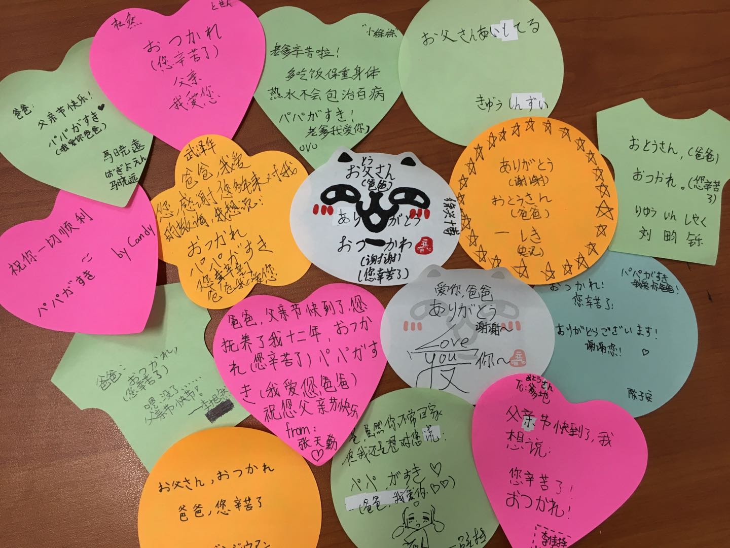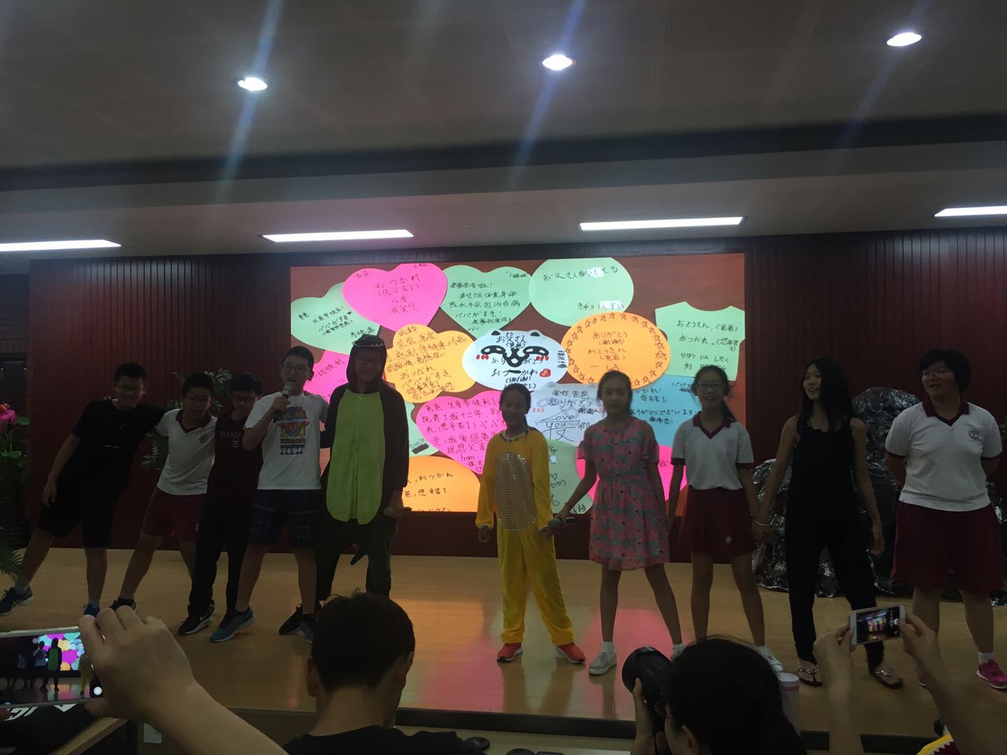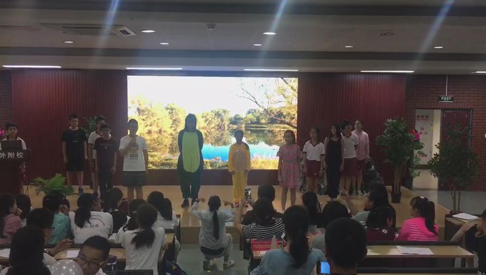 随着剧目排练活动的进展及深入,剧组团队成员的协作能力及凝聚力日益增强。6月中旬的节目展演环节,道具组史记同学组织组员在演出前后清点、搬运道具;学生导演童心悦同学在台下指挥、鼓励台上演员表情及动作;武泽华、徐兴博同学等演员们在台上默契投入的配合,将剧情中的父子冲突及和解情节表现的深入人心;制作播放PPT的李佳泽同学和负责旁白的李玥滢、徐睿涵同学,与台上演员的每一帧表演精准配合,协调默契,展演过程中处处散发着友谊的温暖与团队的力量。李玥滢同学还根据父亲节节日契机设计了父亲节感恩寄语环节,在学生们齐声演唱《爸爸去哪儿》的日语版歌曲时,大屏幕上展示了每位学生用日语写给父亲的父亲节感恩卡片,两位旁白还到台上对父亲们表达了感恩及节日祝福之情,这一环节给台下观赏展演的父亲们留下了难忘的回忆。
