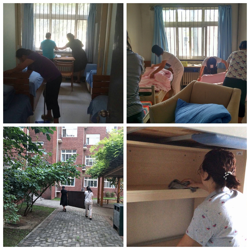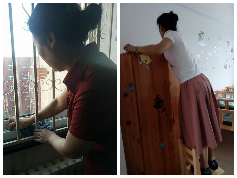 本学期宿舍安排变动较大,老师们搬床挪柜,楼上楼下搬运学生被褥,一个个挥洒着汗水,却没有一个喊累。将宿舍房间从上到下、由内及外都开始进行了细致的清扫,上到灯罩空调,下到地面死角,里到暖气片,桌子衣柜,外至窗户的缝隙,全部打扫的干干净净。预科班本学期更换的新的桌椅浮尘较多,除常规消毒外老师们开窗通风并对桌椅进行反复擦拭以减少浮尘和异味。