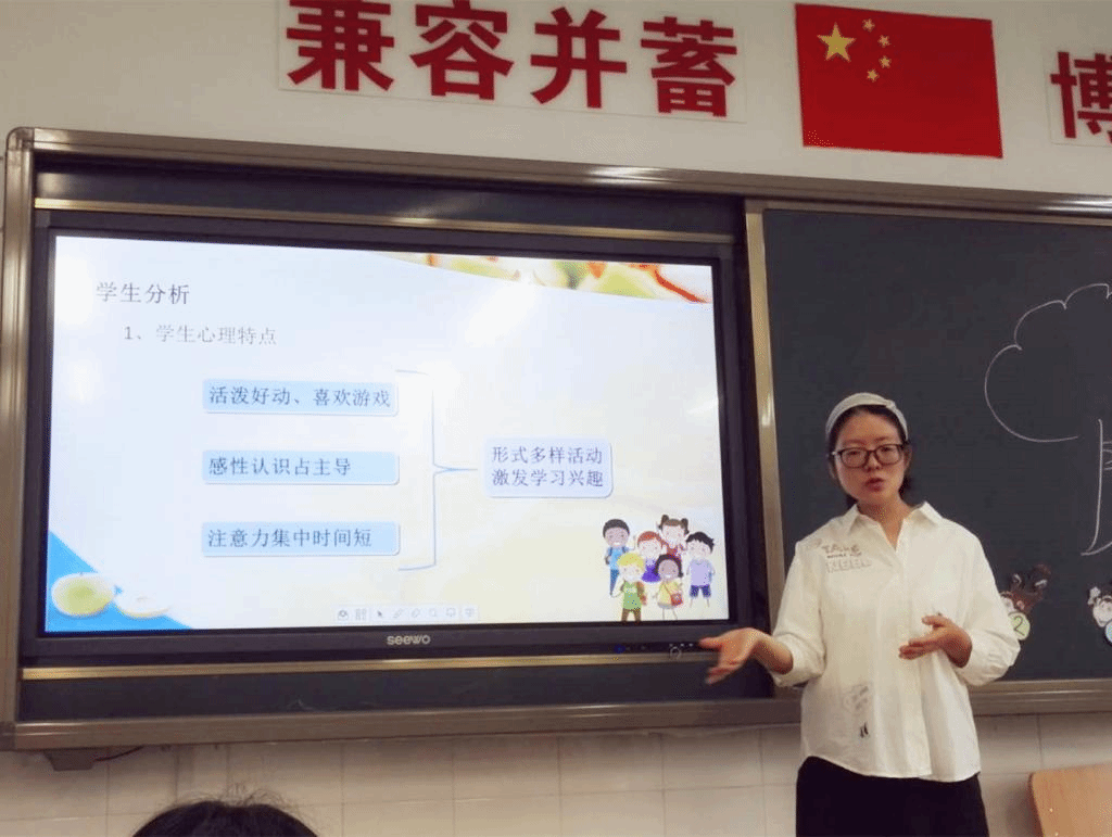 第二组的王琳老师充分分析了教学背景,细致地了解学生的英语水平,并在此基础上进行课堂设计,制定合理而有针对性的教学目标。该组通过生动的实物展示、板书设计,给学生创设了比较具体的语言环境,通过一系列活动,学生也能够多开口练习,以达到熟练掌握的效果。
