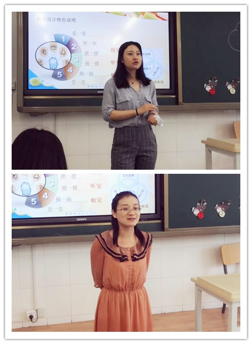 第二部分为优秀说课展示,英语教研组长季老师对新教师的说课进行了点评,对于各组的优点给予肯定,也针对欠缺之处提出了建议。随后,季老师展示了该课的优秀教学设计:通过多感官活动实现多元操练,以英语学科核心素养为指导,利用各种资源充分调动视觉、听觉、触觉等感官,帮助学生更有效地掌握新知。这一环节开阔了新教师的思路,对于新教师如何设计教学有很大帮助。