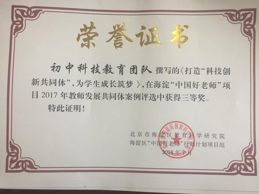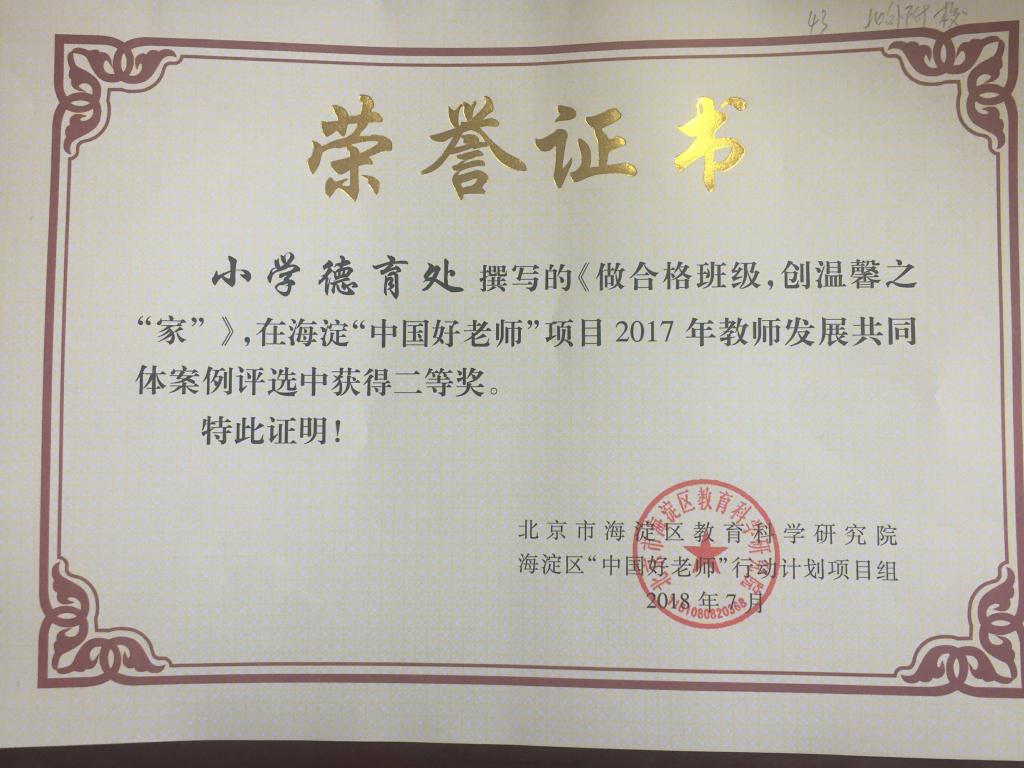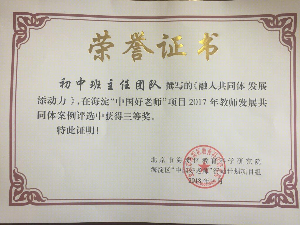 近日,在中国好老师项目——“教师发展共同体”建设案例评选中,我校有4篇(海淀区共计37篇获奖)分别获得二等奖和三等奖,其中中学德育处的《营造氛围、搭建平台,提升高中班主任职业幸福感 》、小学德育处《做合格班级,创温馨之“家”》荣获二等奖; 初中班主任团队和初中科技教育团队提交的《融入共同体 发展添动力》、《打造“科技创新共同体”,为学生成长筑梦》 同时荣获三等奖。