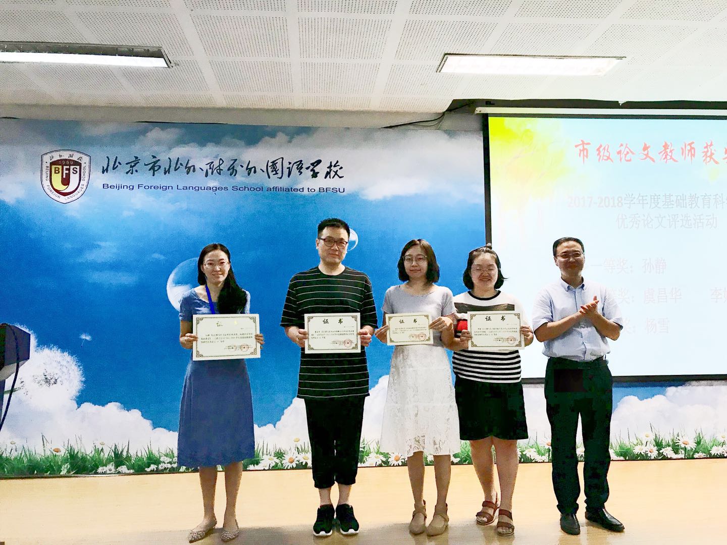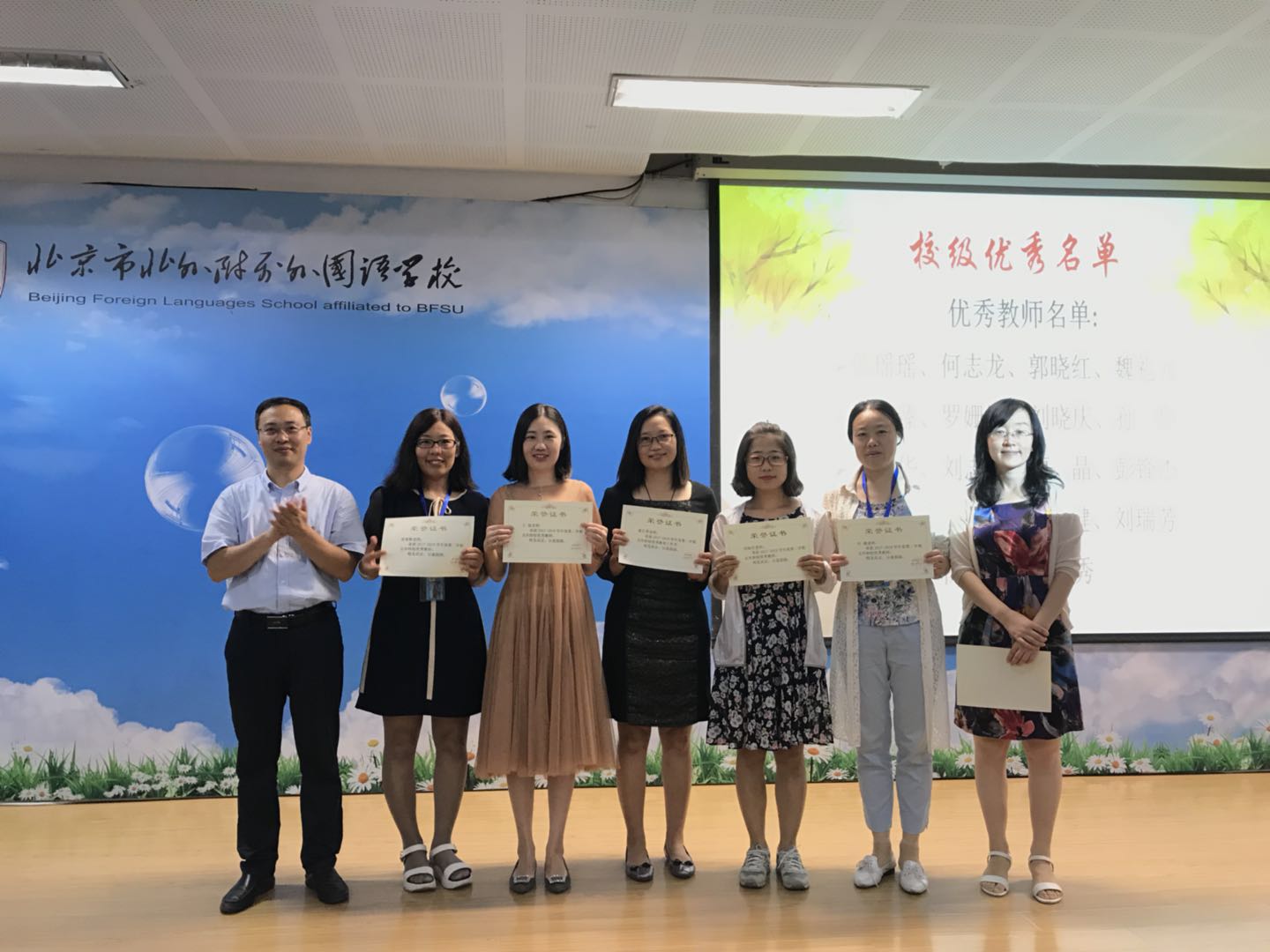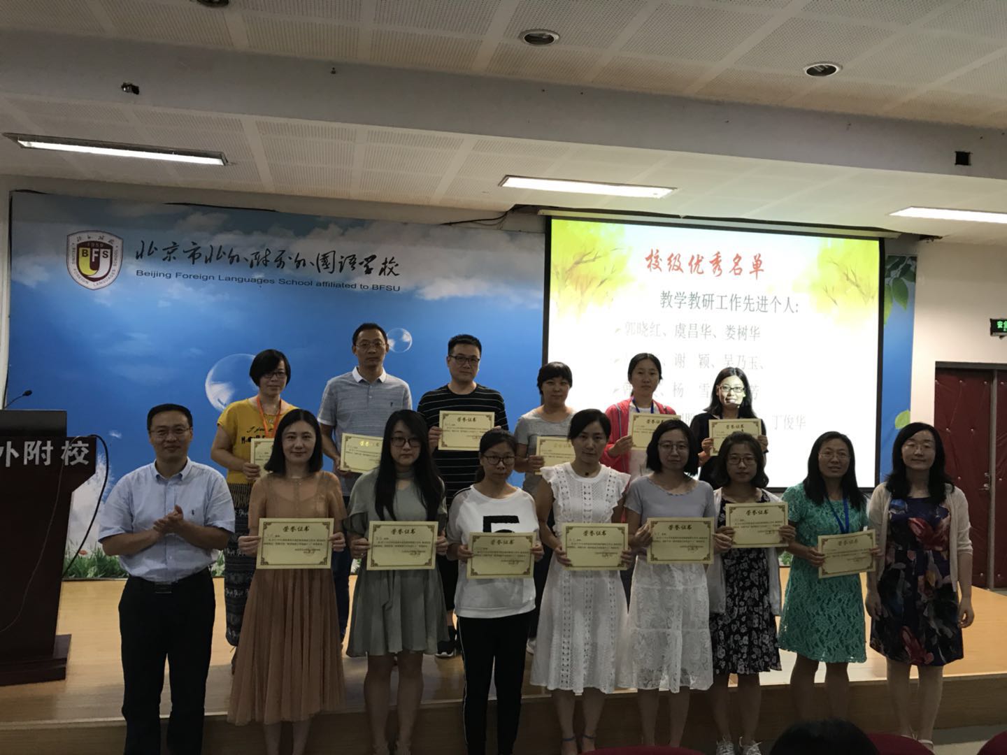 孙静首先介绍了高中新入职的教师。接着,她总结了上学期高中的各项工作及取得的教学成果,并对上学期在海淀区和校内获奖的教师进行表彰。高雁鸣、王静为获奖教师颁发了奖状。