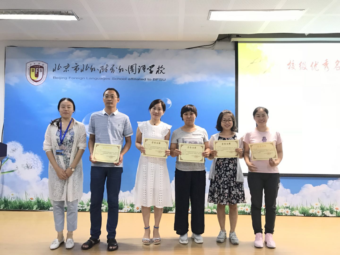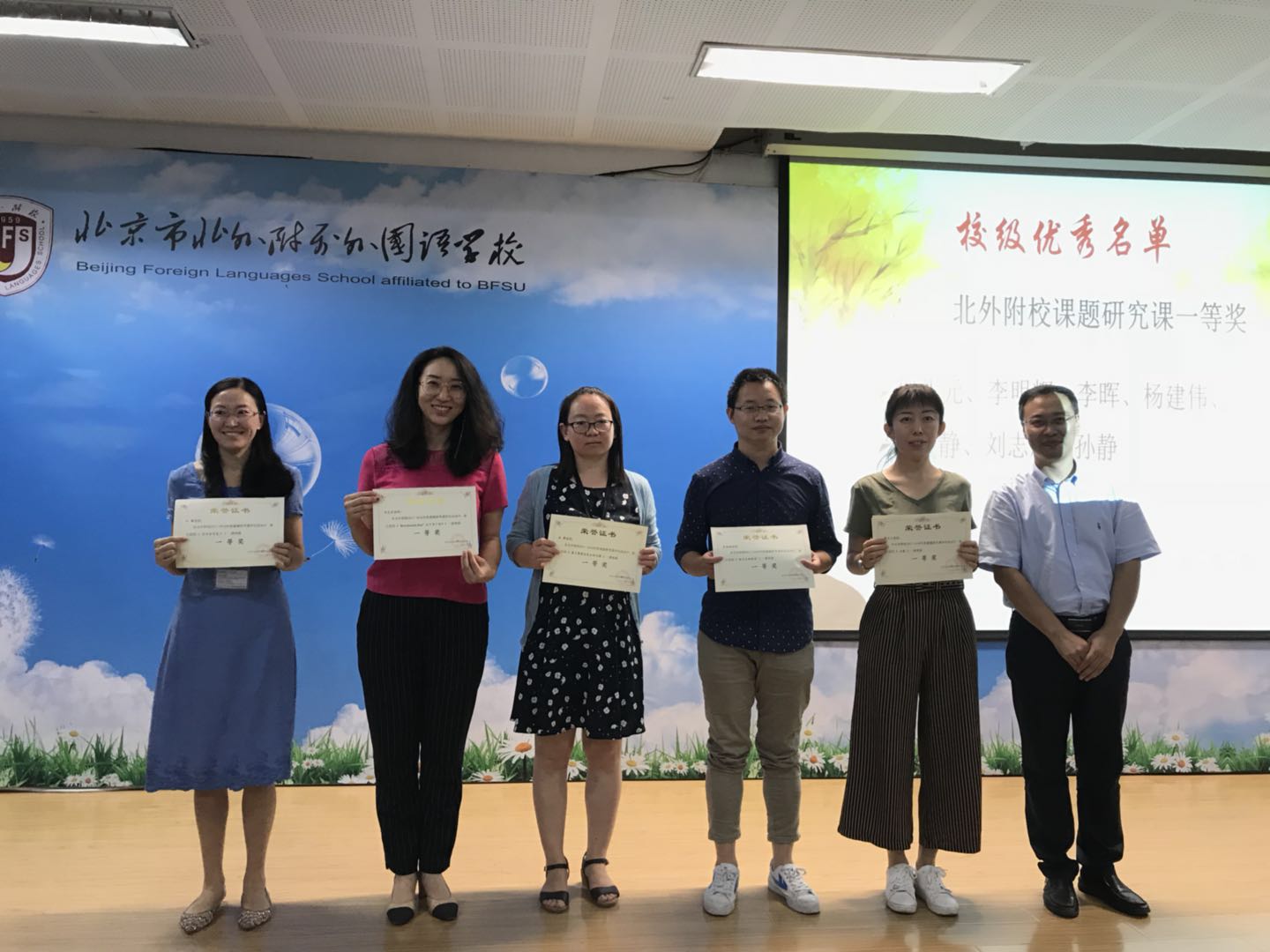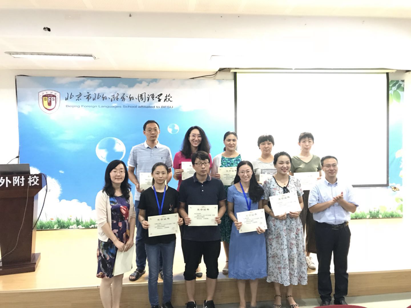 孙静首先介绍了高中新入职的教师。接着,她总结了上学期高中的各项工作及取得的教学成果,并对上学期在海淀区和校内获奖的教师进行表彰。高雁鸣、王静为获奖教师颁发了奖状。