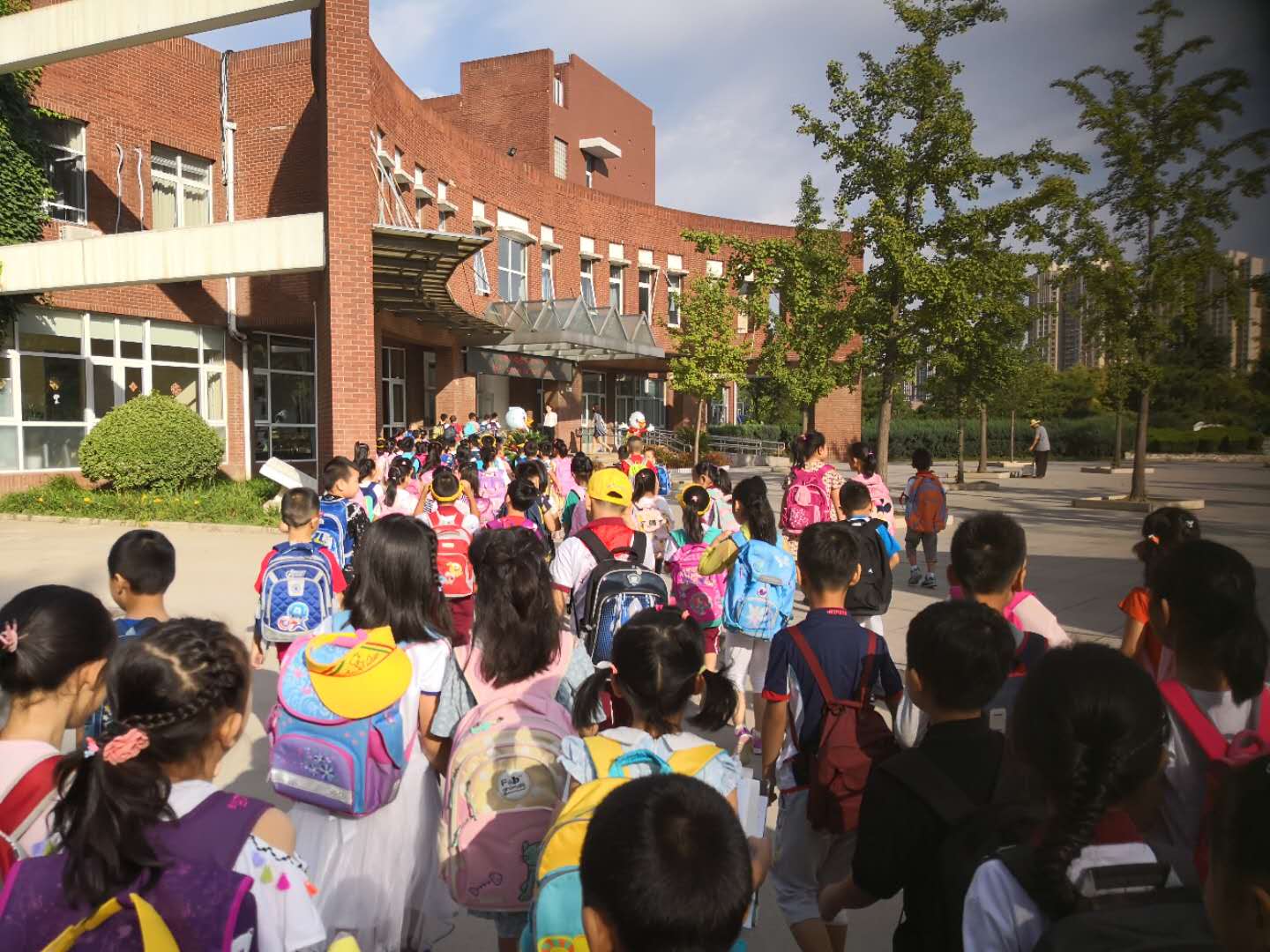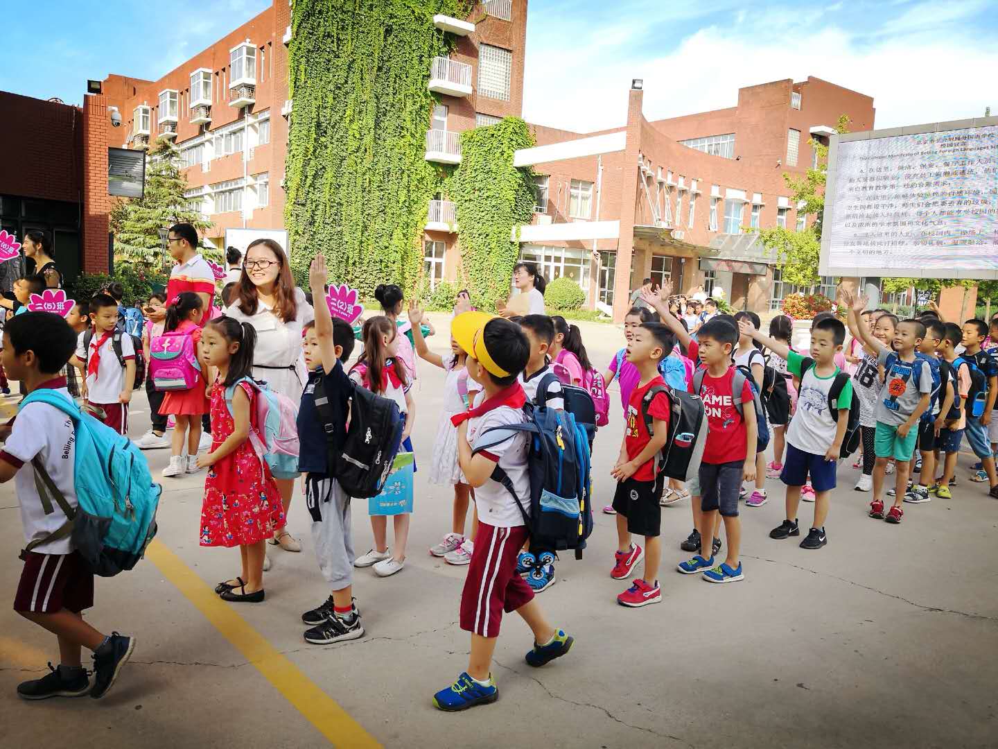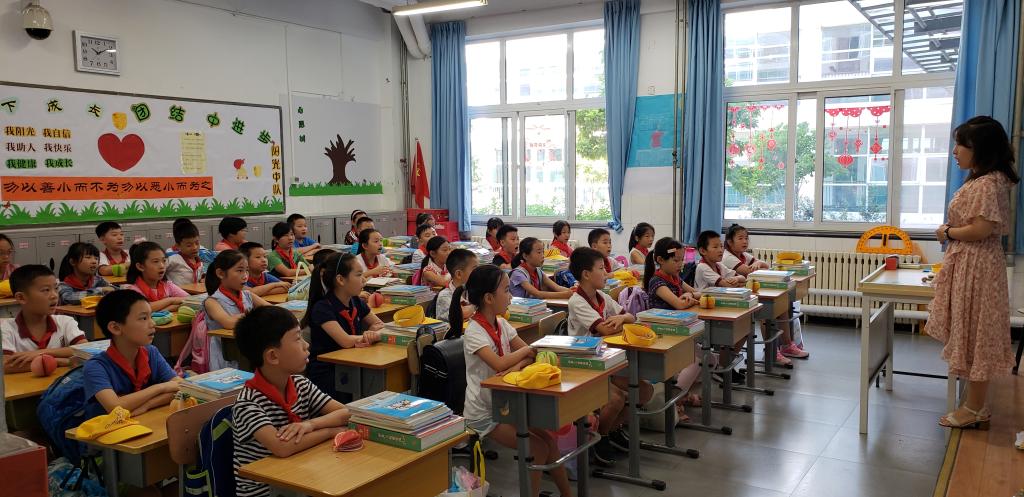 2-4年级学生上午9:00报到,5-6年级下午3:00报到,可提前一个小时就有学生来到校门口。可见孩子们是多么期待早早开学返校啊!孩子们背着书包在家长的陪伴下,兴高采烈地来到久别的学校,东瞅瞅西望望,仿佛到处都是新的。他们走进焕然一新的教室,见到和蔼可亲的班主任老师主动问好,有的热情拥抱,有的主动攀谈,跟老师聊着暑期的故事……仅仅两个月假期,孩子们又长高了一大截。住宿生及其家长们,更是大包小包,穿梭而至。在教室里,孩子们按照要求一一分类上交暑期各项作业,聆听班主任老师对于新学期提出的希望和要求。