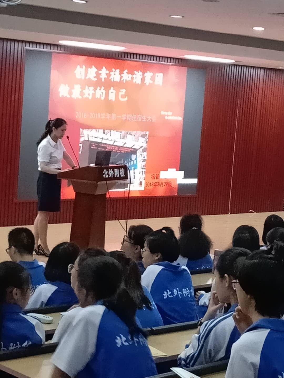 为保障高中住宿生在校学习和生活的品质及自主管理能力的提高,以“创建幸福和谐家园、做最好的自己”为主题的2018---2019学年第一学期高中住宿生大会,于9月2日晚自习时间在二阶召开。会议由高中德育主任郭晓红主持,宿管中心主任李洪杰及高中全体师生参加。