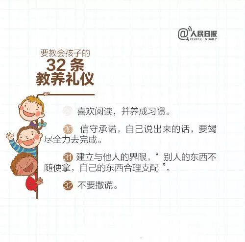 一个孩子的教养高低,是父母家庭教育成功与否的集中体现。下面是要教会孩子的32条教养礼仪。正值暑假,请老师转给学生家长,通过学校和家庭的共同努力,这个暑假,让孩子更有教养。