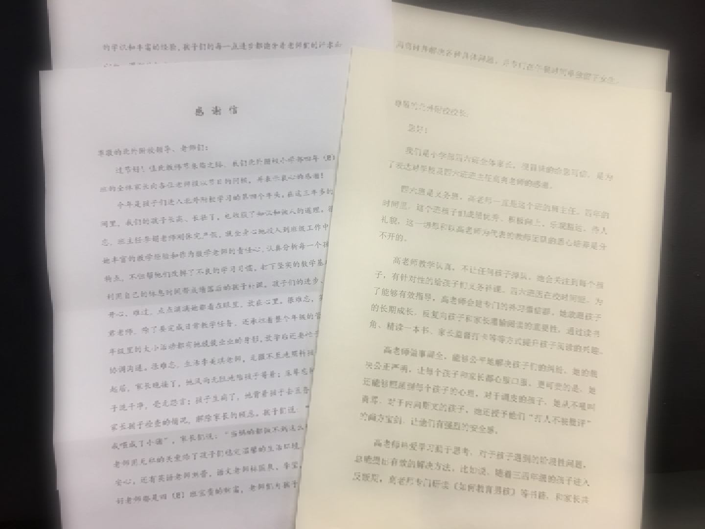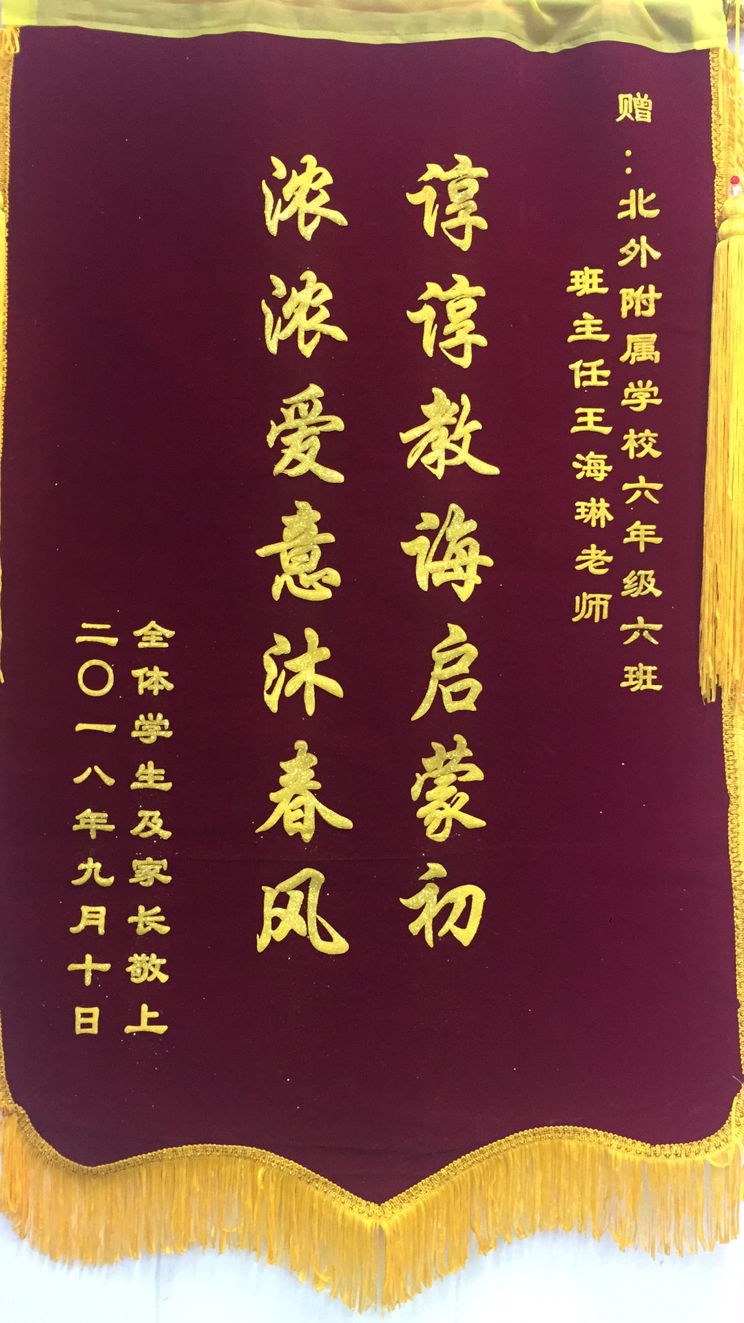 感谢信里述说着孩子成长路上那些令家长无比感动的小事。厚重的锦旗上写着“启蒙之步受益终身,授教固有方,桃李满天下”,“谆谆教诲启蒙初,浓浓爱意沐春风”。家委会代表感言:“这个节日,我们没有鲜花,没有蛋糕,有的只是一片真诚的心,诚挚地感谢北外附校老师们兢兢业业,用心爱我们的孩子!作为家长,我们深知养育孩子的不容易。老师们每天面对着几十个孩子,除了照顾他们生活,教他们学业上的知识,还要帮助他们树立正确的人生观价值观,养成良好的学习习惯,责任非常重大。在母亲节和父亲节的时候,学校组织了活动,老师们带着孩子做出精致的卡片,教育孩子们体会父母恩情,在今天这个属于老师的节日里,我们也要带着孩子道一声:感谢老师,您辛苦了!”