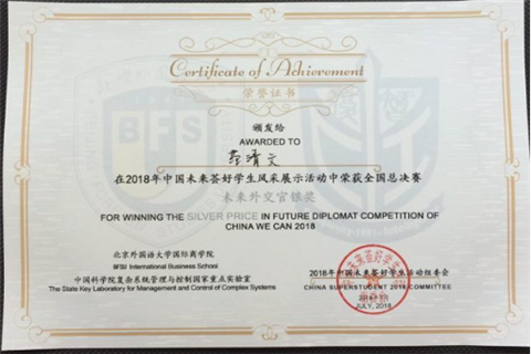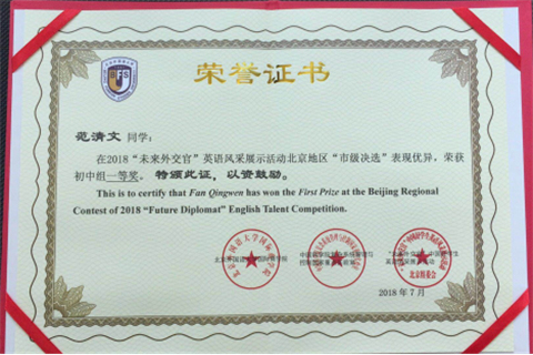 在刚刚结束的2018未来外交官英语风采展示活动全国赛中,我校初中多名学生经过主题演讲,即兴问答,才艺展示和现场答辩等形式通过一轮轮晋级,终于脱颖而出。初二7班范清文获得“市级决赛”一等奖和全国总决赛银奖的好成绩。初二2班李伽茵和杨乐陶获得总决赛二等奖,初二3班鲍昕然获得三等奖。