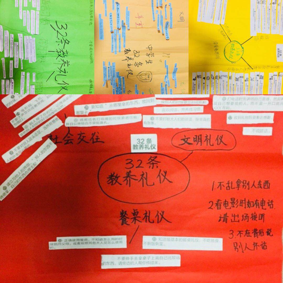 “衣冠上国,礼仪之邦”,一首悠扬辗转的《礼仪之邦》将中国悠久灿烂的礼仪文明向同学们娓娓道来。古老的中华民族文化源远流长,在五千年的历史长河中,形成了高尚的道德准则、完整的礼仪规范和优秀的传统美德。在班队会活动中,同学们被分成四个小组,每组将领取到的32条教养礼仪法则进行讨论、归类、总结,最后梳理出一幅清晰简洁的“思维导图”,再结合同学们的学习生活实际,分别给出3条自己的建议。在展示环节中,每组两位发言人同学进行了精彩的讲解,将自己的领悟和理解与同学们进行分享,并号召大家一起努力践行中学生文明礼仪,做一名“德智体美劳”全面发展的社会主义建设者和接班人。