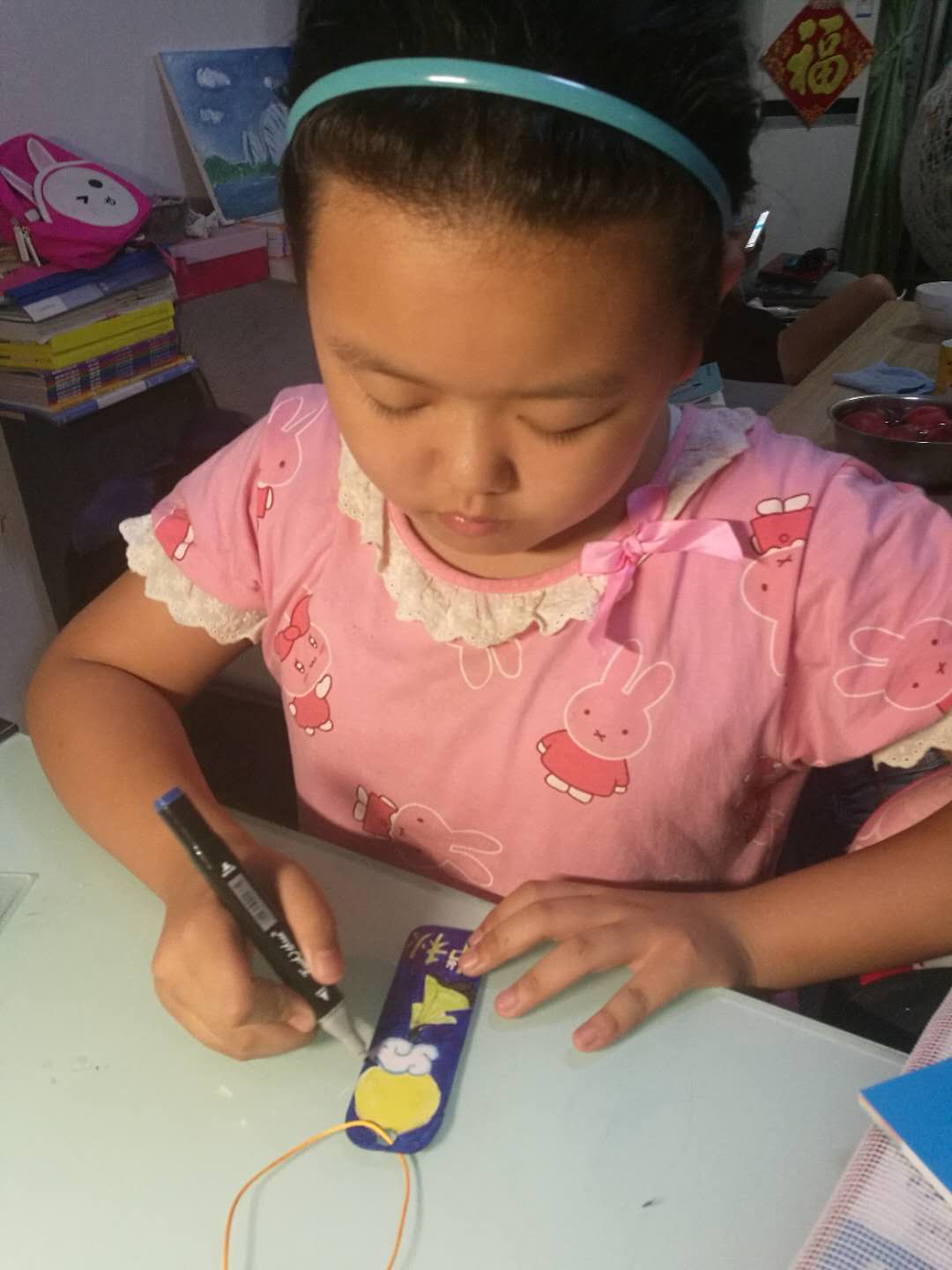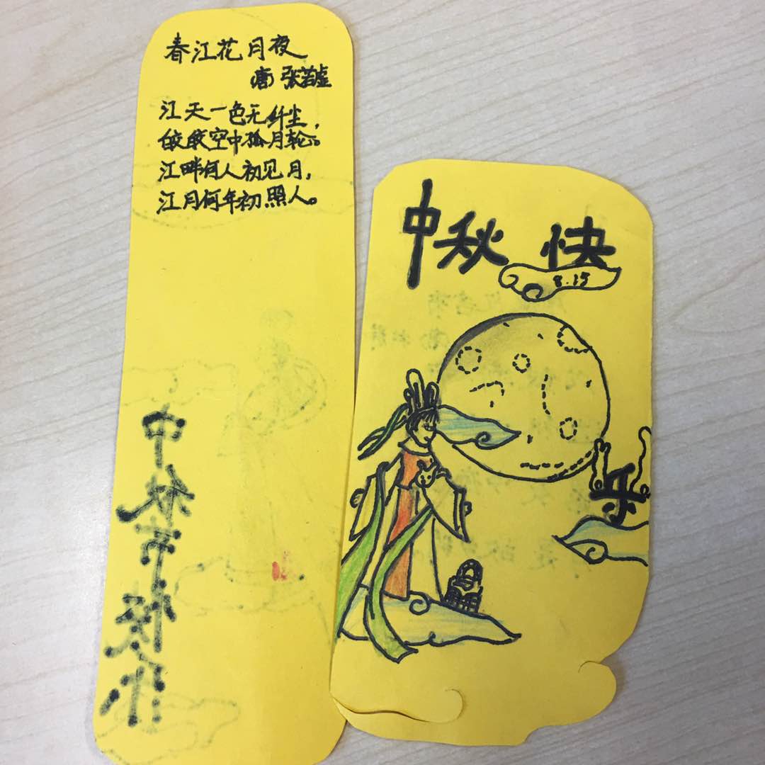 老师们用PPT展示了有关“中秋节”的传统文化知识,孩子们自己当小老师在班级里讲解中秋节名字的由来、中秋节有什么习俗等等。接着,在音乐的播放下吟诵了苏轼的《水调歌头》。孩子们在音乐声中激情地吟诵着,在了解祖国传统文化知识的同时,感受着其中蕴含的无限魅力!教师因势利导,让孩子们在课后做了各种自己喜爱的有关“中秋”、“明月”的小书签,孩子们也乐此不疲地参与着。