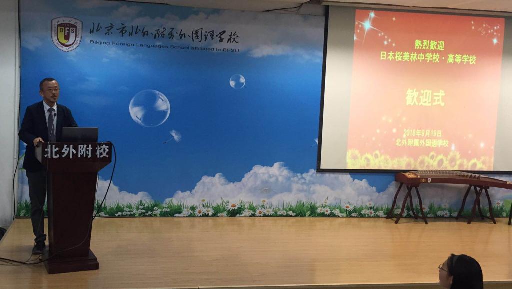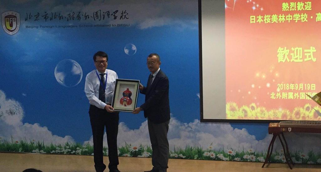 在欢迎仪式上,我校校长林卫民代表学校对樱美林师生的来访表示热烈欢迎,并赠送了精美的礼物。我校初中副校长杨磊致欢迎词,值此中日和平友好条约签署40周年之际,希望两校学生成为中日友好的使者,为中日友谊尽一份绵薄之力。有马部长对我校的热情款待表达了衷心感谢。他希望此次交流活动能够增进两校的友谊,让樱美林学生体会到中国文化磅礴深厚的底蕴。