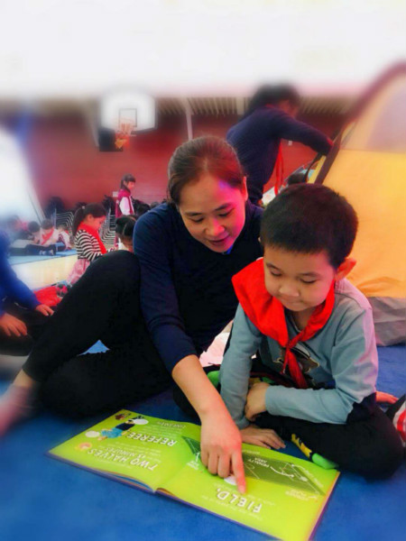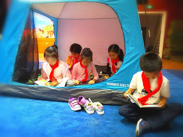 下午三点左右,各班家委会志愿者纷纷入校,带着造型独特、色彩缤纷的帐篷、台灯协助老师们布置夜读环境。在柔和的灯光和舒缓音乐的映衬下,国瑞厅瞬时变得温馨静谧。四点左右,孩子们穿着可爱舒适的家居服,怀抱着自己喜爱的英语绘本,逐一找到自己喜欢的一片小天地开始开启阅读之旅。多数同学在阅读后还主动相互交换阅读。