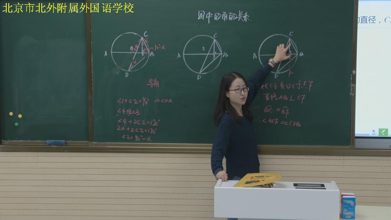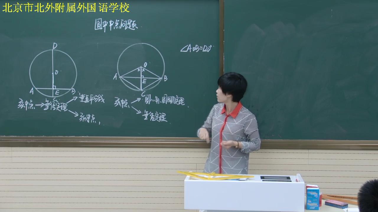 贺丹老师的课题是《圆中中点问题》,在等腰三角形、直角三角形中,中点是很重要的数学条件及结论。她引导学生在圆中见到中点可以有很多联想,通过联想使学生复习回忆了在熟悉的直线型中中点的特殊结论,以及基本图形中给我们带来所需的位置关系和数量关系。贺丹进一步启发学生,放在圆中,由“垂径定理”“一等四等”可以把圆中的中点这一条件转化成我们熟悉的直线形基本图形中的位置关系和相应的数量关系。学生对图形的分析、观察、归纳,使学生对“垂径定理” 、“同圆,弧等,弦等,弦心距等,圆心角等,圆周角等”(以下简称为“一等四等”)充分理解,发展学生的应用意识,提高学生灵活运用中点解决问题的能力。