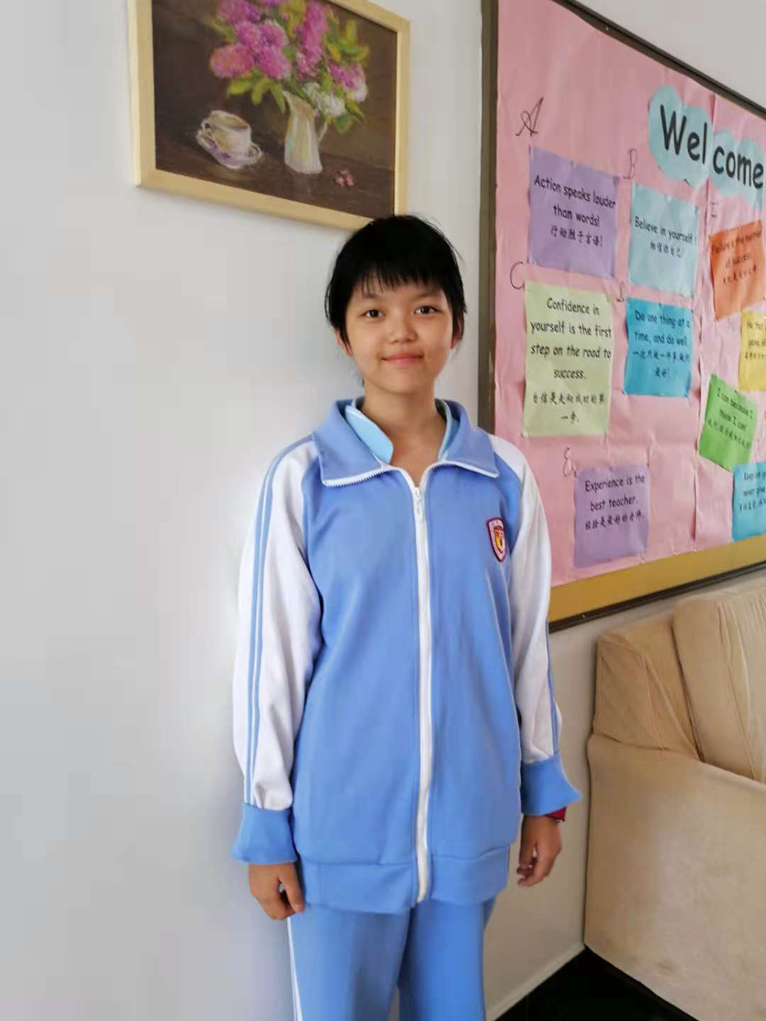 在课余时间,她积极参加丰富得课外活动,参加过义卖和志愿者活动。而且学习书法,绘画,舞蹈,声乐,是一个多才多艺,热爱生活的好孩子。