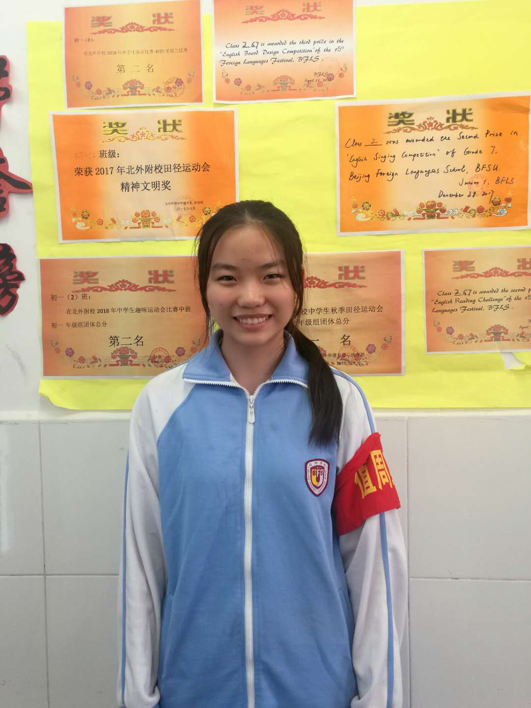 朱玥同学热情开朗,团结友爱,兴趣广泛,学习上努力认真,成绩优异。担任班级的宣传委员,积极组织同学参与各项文宣活动,布置的板报也多次获奖,为班级争得荣誉。在我校与央视《谁是球王》栏目组的合作活动中,朱玥同学作为负责人,协助老师积极组织活动,并担任主持人。今年世界杯比赛期间,朱玥同学从众多候选人中脱颖而出,作为世界杯小旗手之一前往俄罗斯,成为绿茵场上亮眼的中国风景。