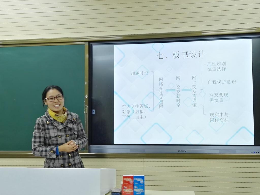 最后说课的是王敏老师,课题是《友谊新时空》。她在课前做了问卷调查,充分了解了学情和学生在这节课上的困惑,为设计这节课提供了资料和依据。教学过程,引用学生感兴趣的话题,调动了学生的学习积极性。