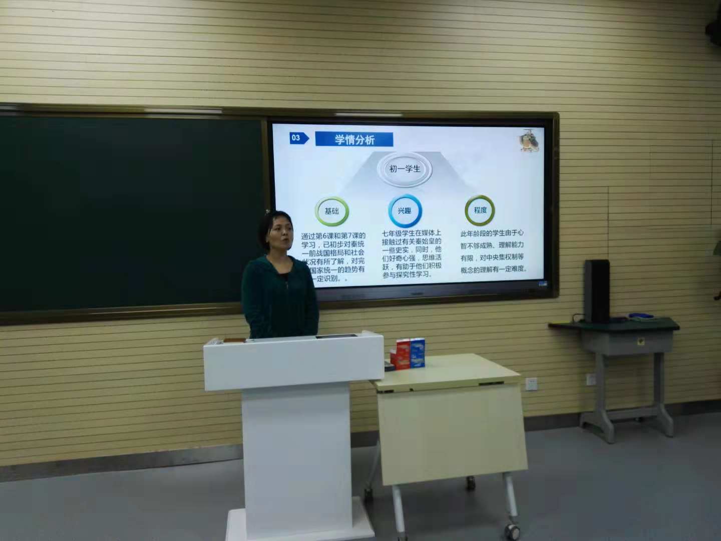首先说课的是章继华老师,课题为《秦朝的统一》。她首先分析了教材和学情,教材分析抓住“统一”两个字,强调疆域统一、权力统一、制度统一,切中教材的重难点。教学过程首先用一张幻灯片把这节课的整个流程显示出来,一目了然,左边是教师的教学活动主线,中间是知识点的逻辑主线,右边是学生的学习活动主线,三位一体把这节课教学过程呈现出来,这是目前教学比赛中比较倡导的一个环节。其次再分别对每一个教学环节进行解说。