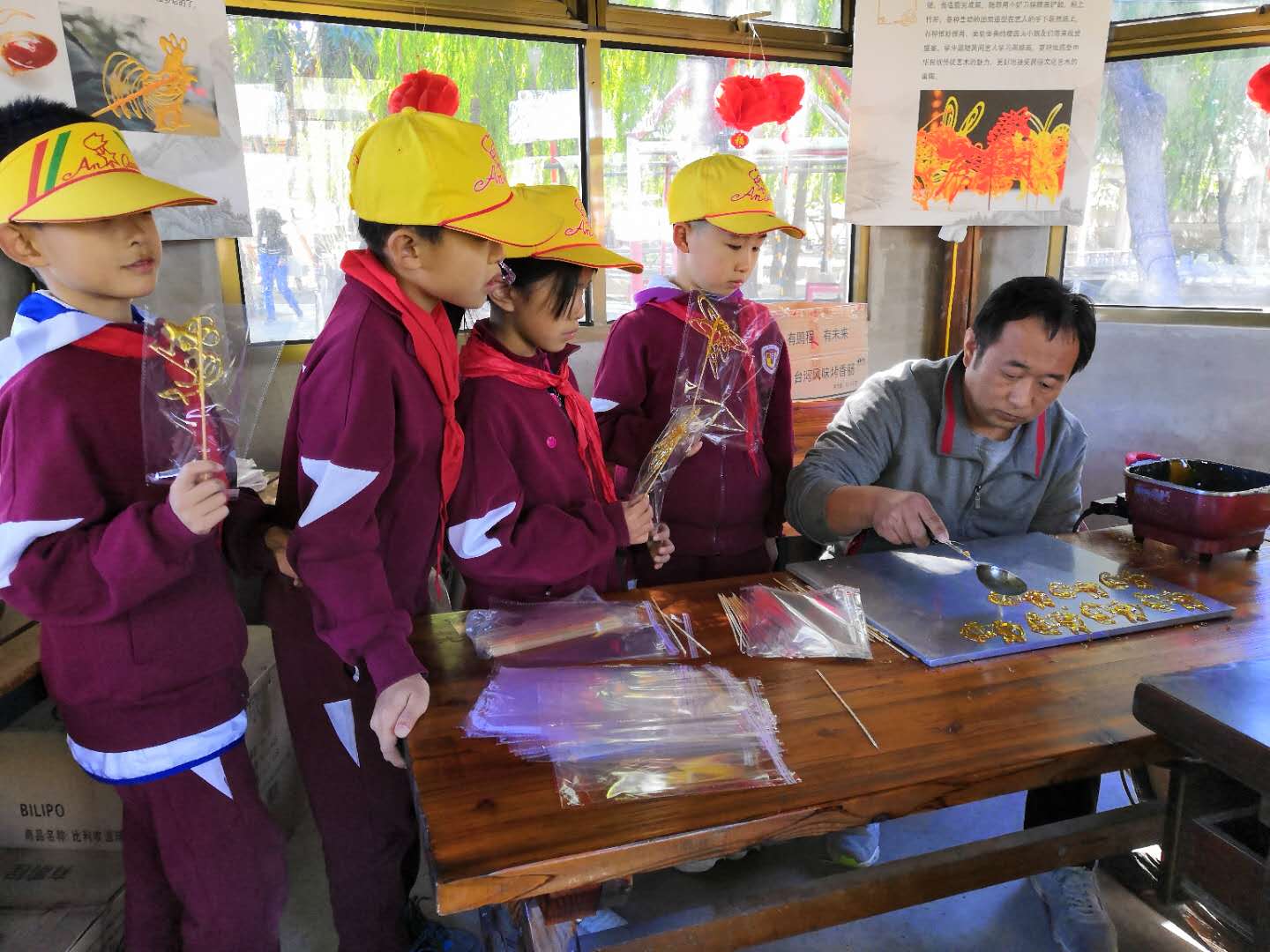 进园后,各班分组分别体验非遗传承人“面人张”现场教学制作面塑,及糖画传承人现场教学之外,学生们还体验画脸谱、穿葫芦、DIY 小帽、刮画、剪纸、中国结、珠算、丝网印刷等十项动手课程。学生们还使用道具参与民俗表演跑驴传统活动。