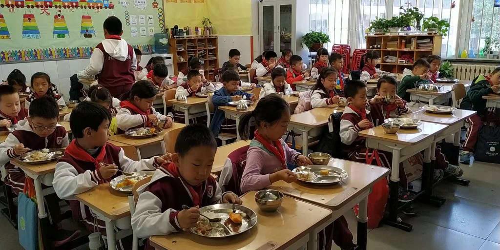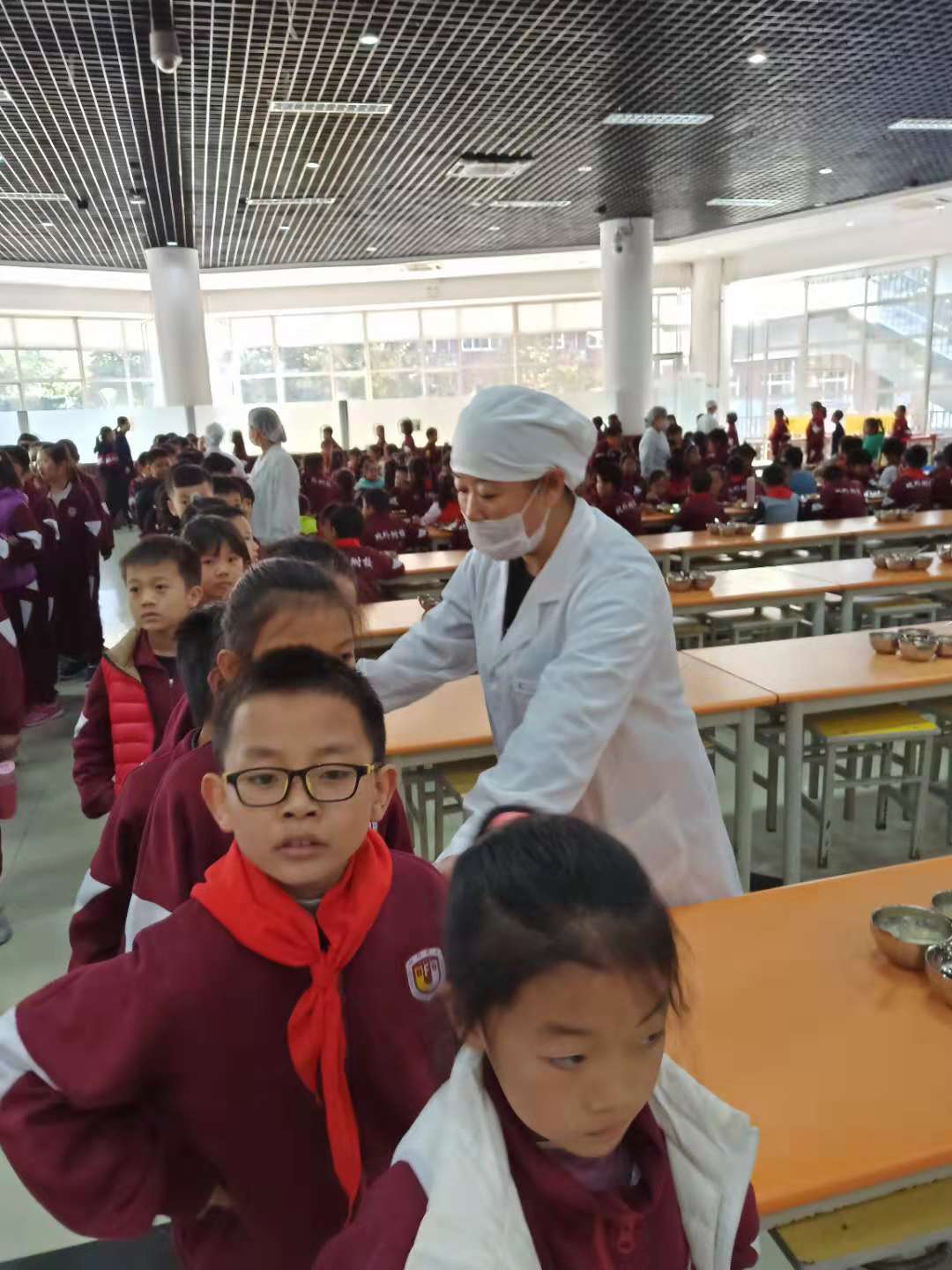 三年级孩子们在餐厅排着整齐有序的队伍打餐,自己端餐盘