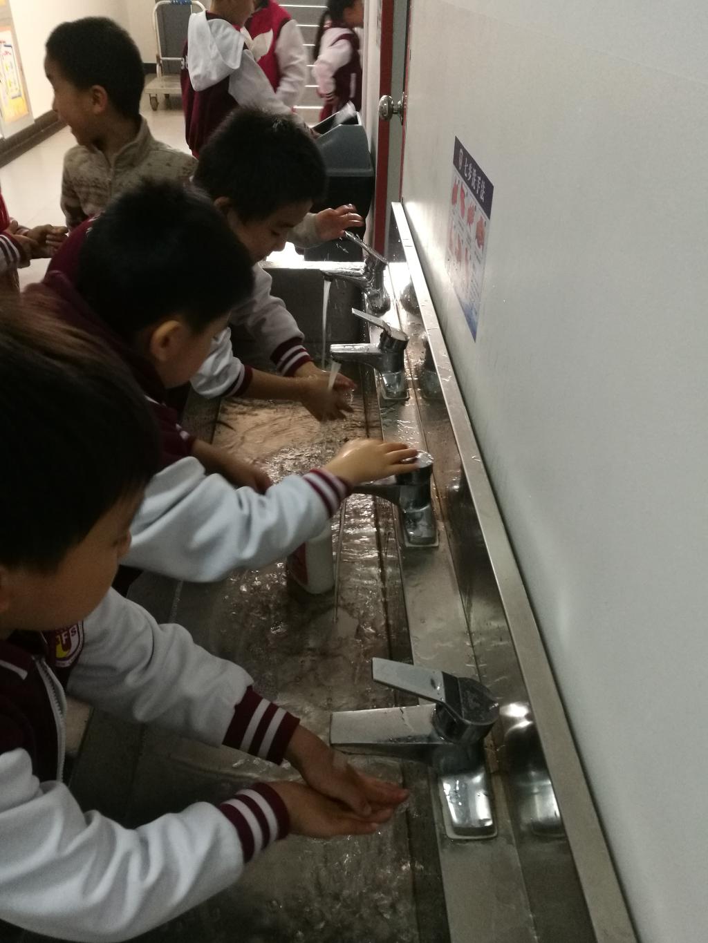 二年级同学整齐排队洗手