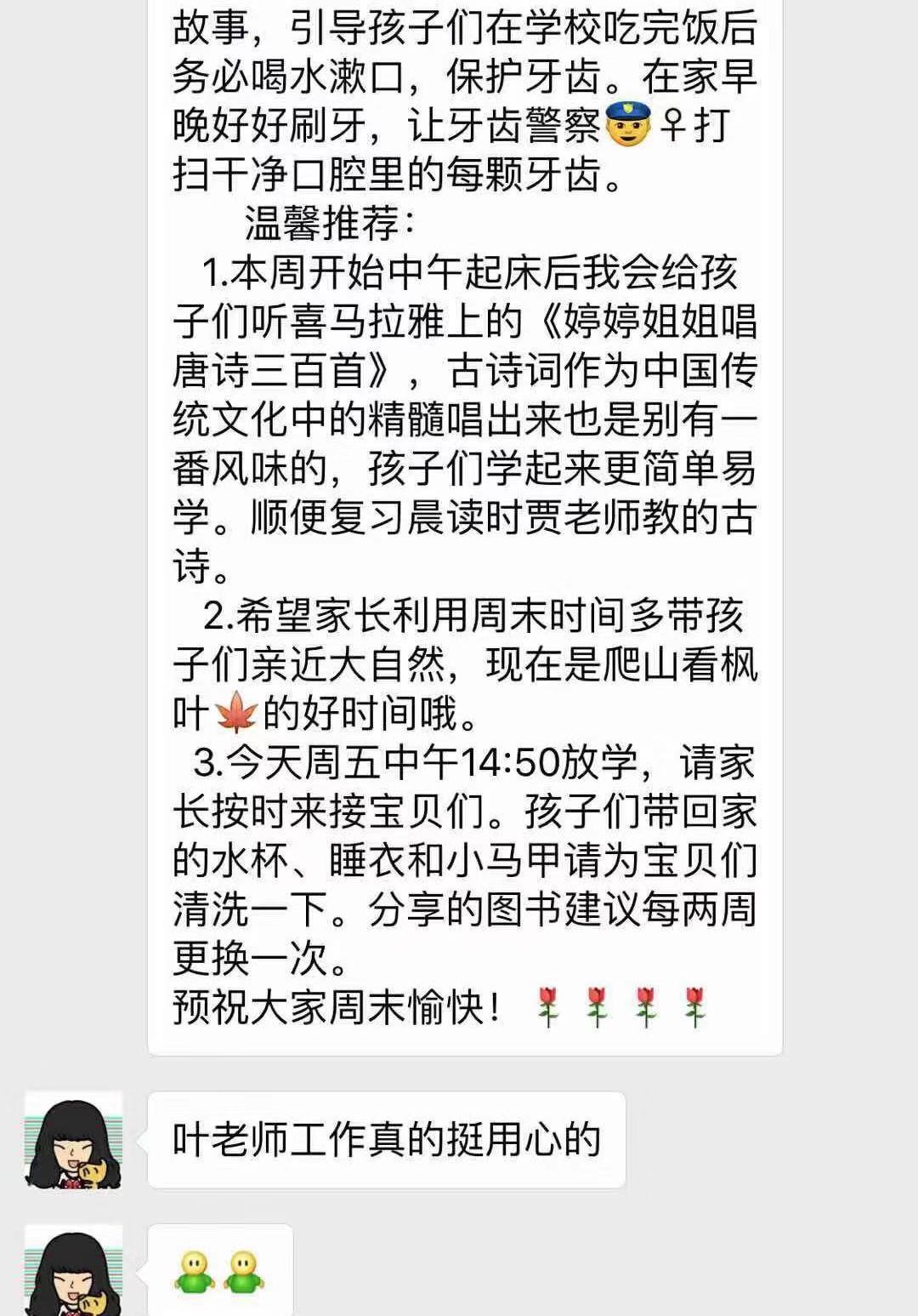 —————————————————————————————————————————————————————————————以下是来自学生家长对宿管中心预科班老师们的反馈。孩子的喜爱和家长的认可,是老师们最高的荣誉!为我们的老师们点赞!