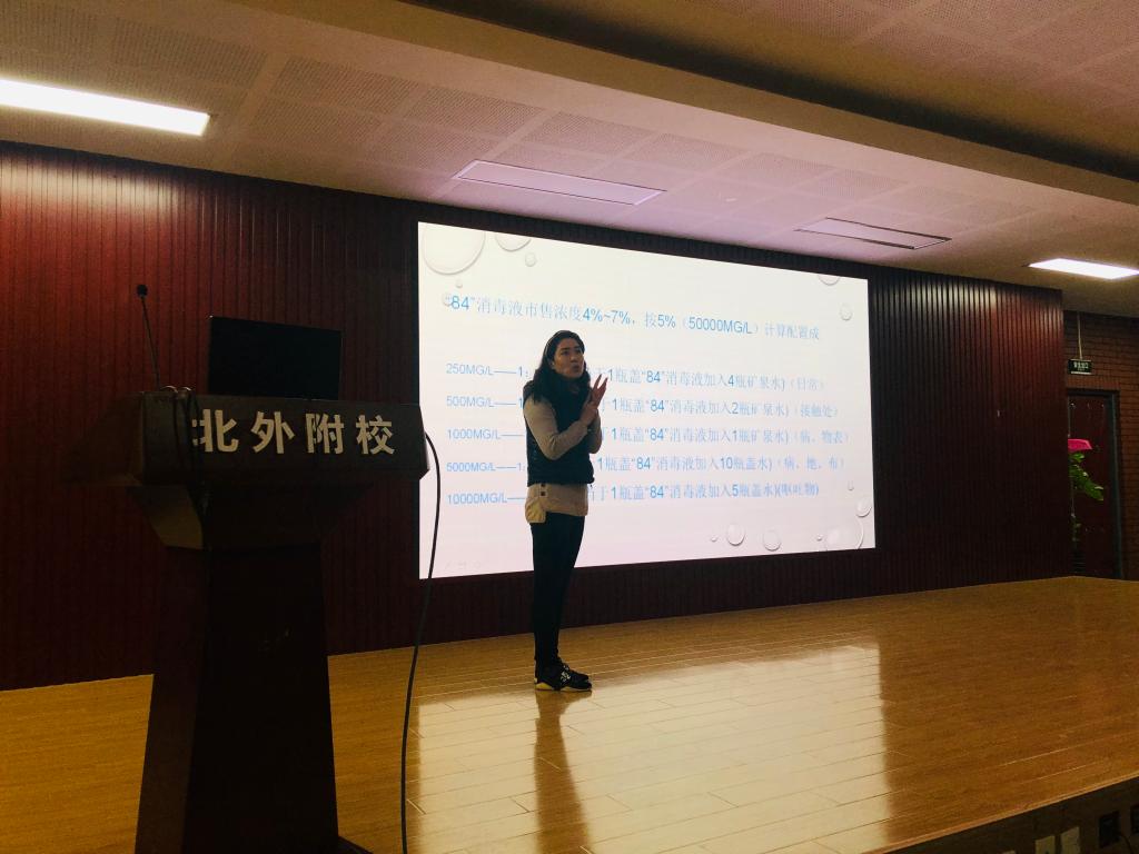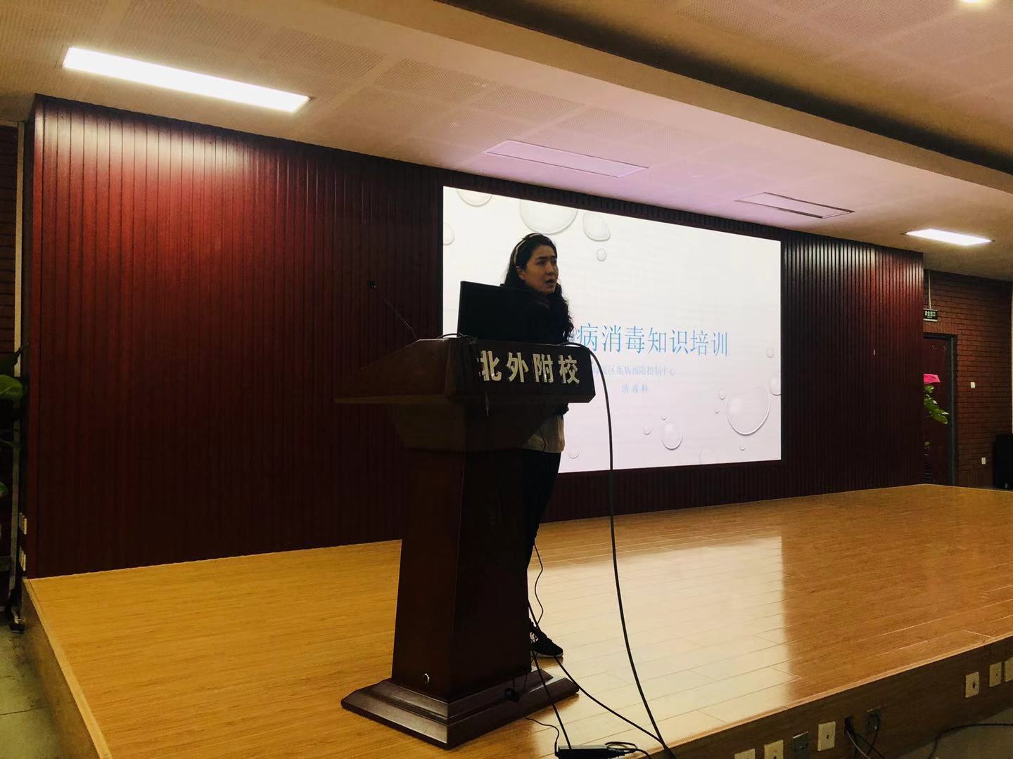 培训中,李洪杰主任为老师们主要讲解了如何做好日常消毒工作,以及发现校园中学生有呕吐、腹泻、发热等症状时如何按规范流程处理。强调老师应对因病缺勤的学生进行“一看二听三问四查五追踪”(看学生状况、听学生及家长的描述、问学生自己或家人有无出现类似症状、查个人、教室、宿舍的卫生、电话跟踪了解学生病情变化及诊治情况)的常项工作。指出若发现呕吐等症状,应按照海淀区疾控中心消毒科的指示,严格执行消毒步骤进行消毒,预防传染病的发生。