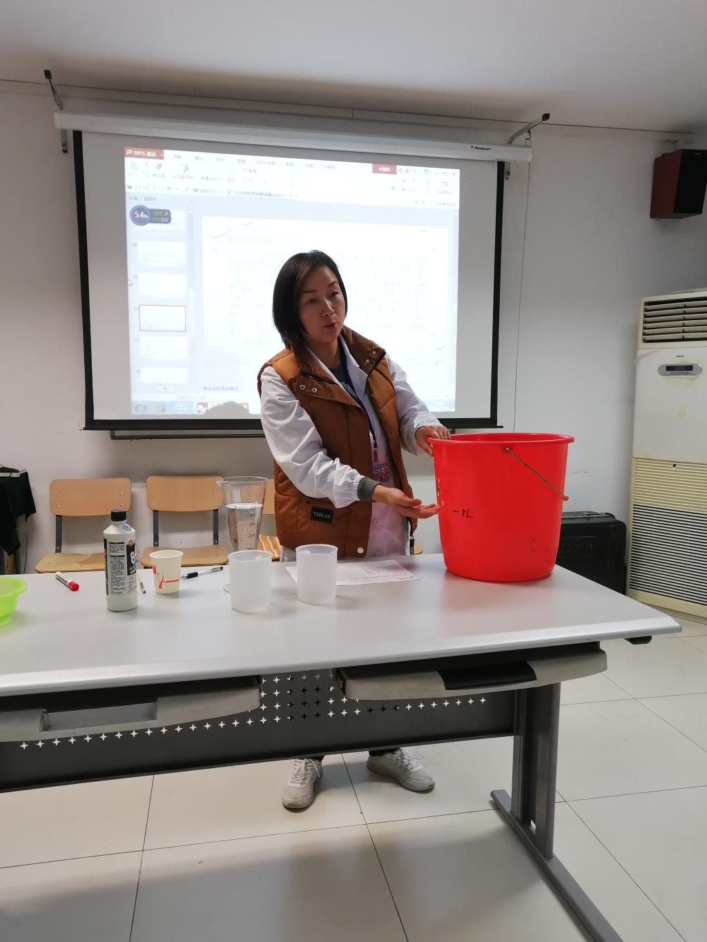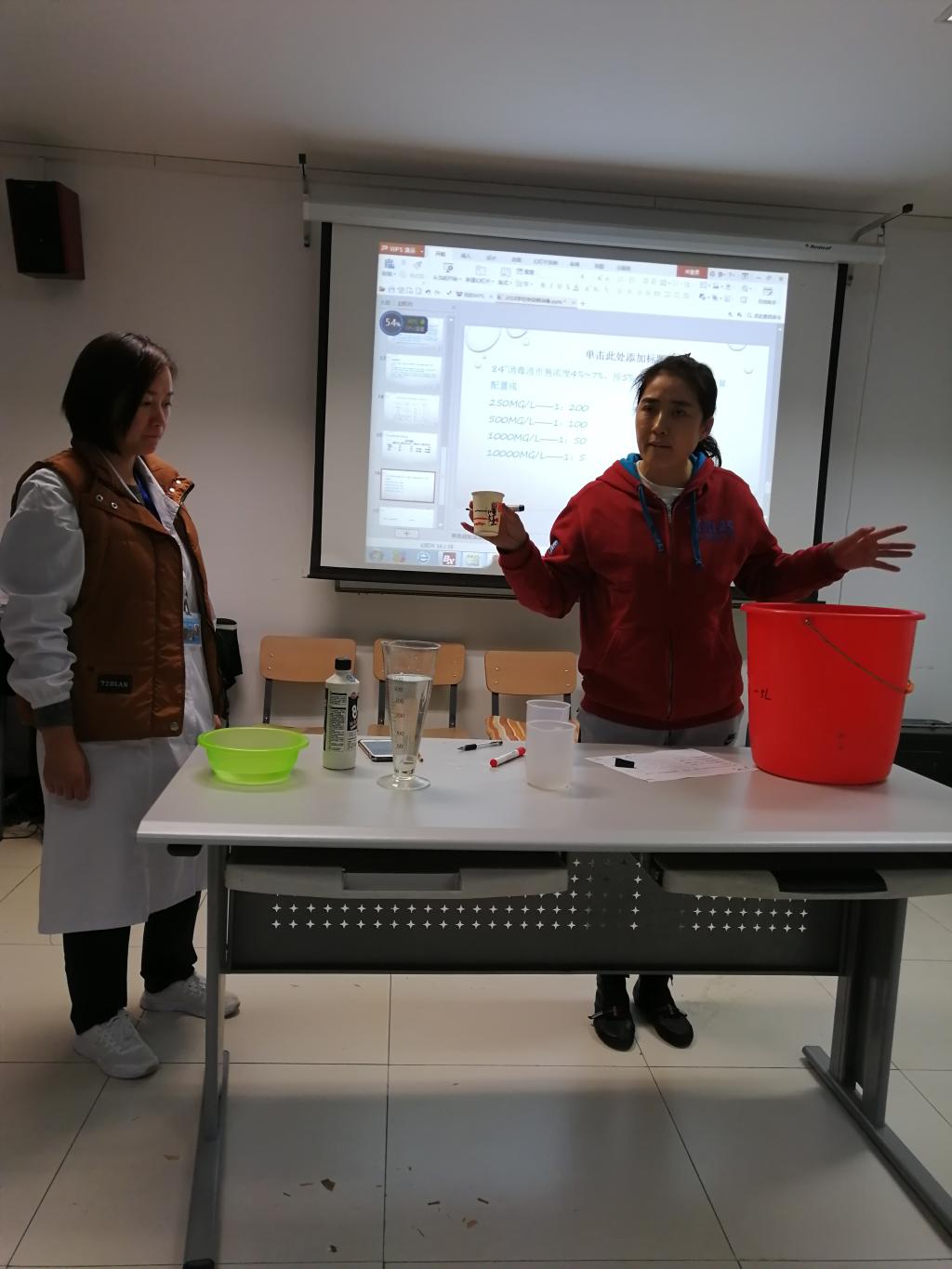 医务室郭汉武医生用通俗易懂的方法为保洁人员进行各类消毒液的配比演示,如物表擦拭、拖布浸泡、厕所便池清洁、呕吐物处理的消毒液配比法,让他们逐渐熟悉掌握日常消毒工作。宿管中心李洪杰主任为保洁人员重点讲解了呕吐物处理方法和流程。