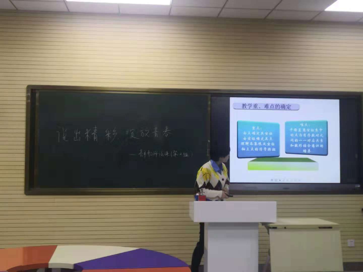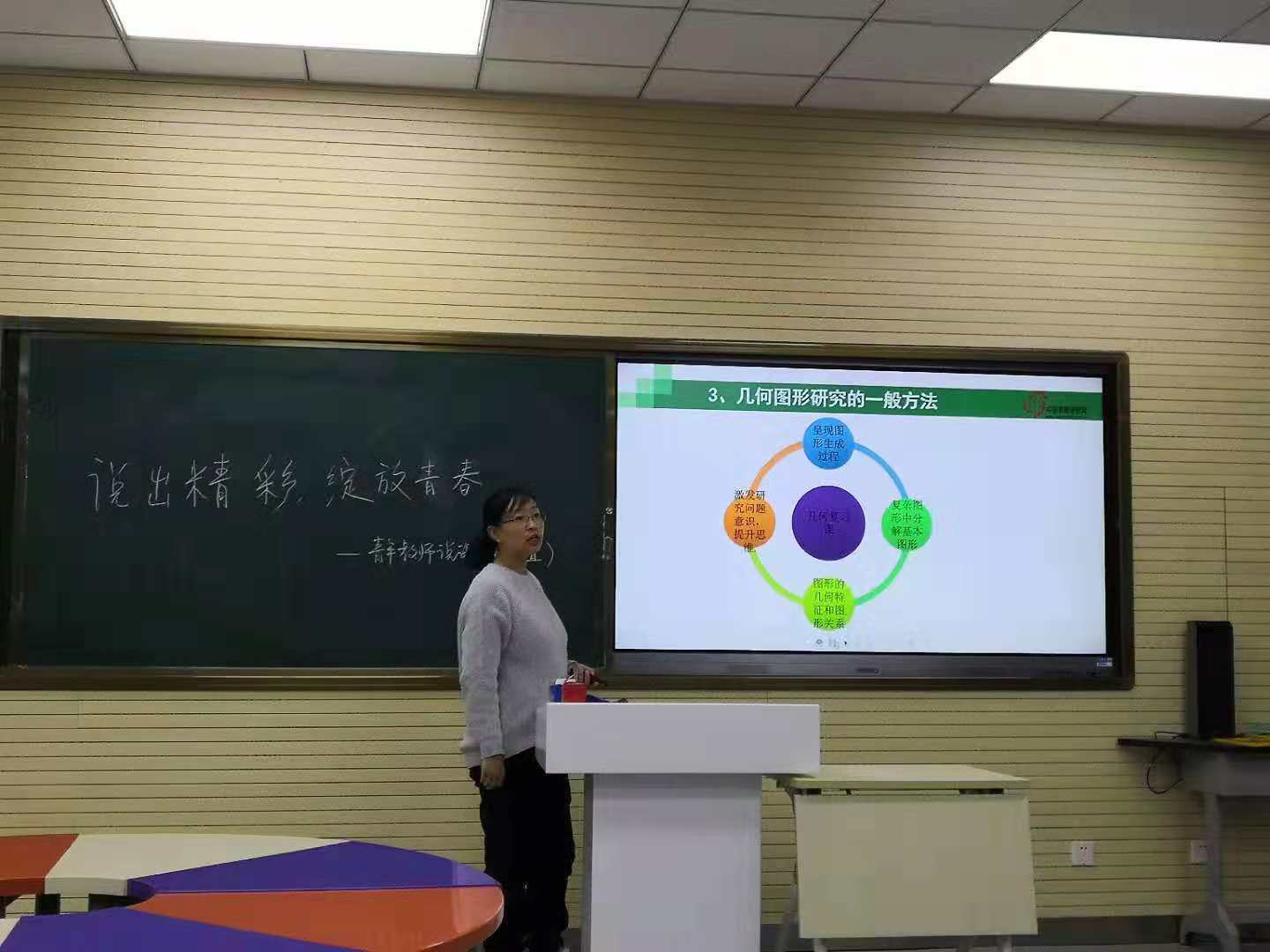 宋宗伟老师课题是《几何综合说课》。宋老师从指导思想与理论依据、内容及内容解析、目标和目标解析、教学问题诊断分析、教学支持条件分析、教学过程设计、目标检测设计等七个方面进行说课。重点阐述了几何学研究的对象是图形,培养图形的感知能力是教学的关键。