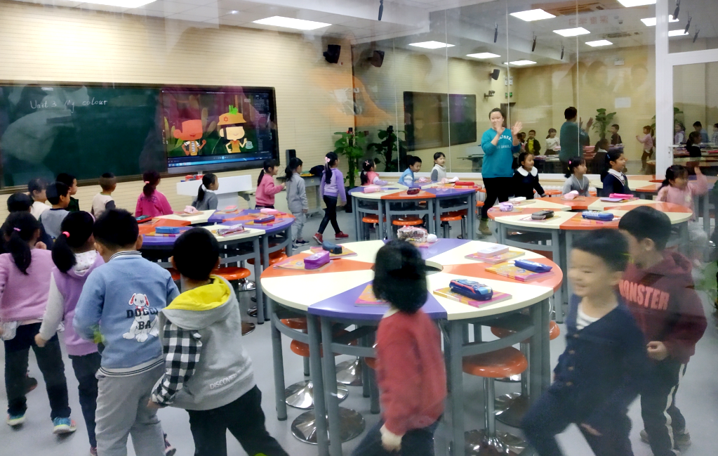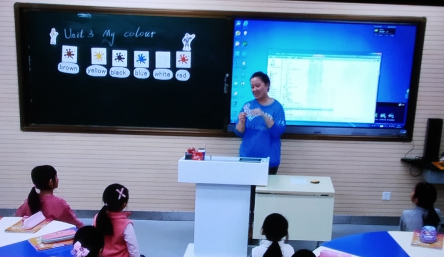 解老师以小朋友们非常熟悉Kid’s Box的书本内的3位主人公不同颜色的穿戴为导入,让学生对本节课的“颜色”主题有了直观认识的同时,还适当运用了孩子们喜闻乐见的词卡。在课堂活动环节,解老师在黑板上展示了2颗苹果树,分别属于Maskman和Maria,让小朋友们把红黄蓝棕绿黑不同颜色苹果贴在不同位置。在练习环节,通过猜词和PPT等形式,帮助小朋友对所学内容进行巩固。小朋友坐得非常端正,更可贵的是不失幼儿阶段应有的天真、活泼与灵动。这正是在贯彻我校“推进‘为兴趣而教’行动,精致地关注学生的学习;‘让所有学生的学习真实地发生’要落实到每一节课堂”的总体要求。