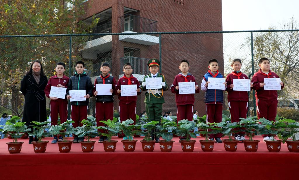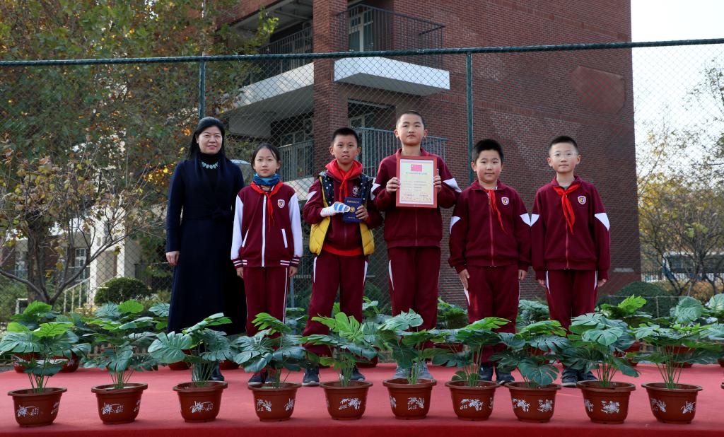 最后,大队辅导员席老师宣读了上周的师生获奖情况,刘校长和孟校长为获奖师生颁发奖状并合影。