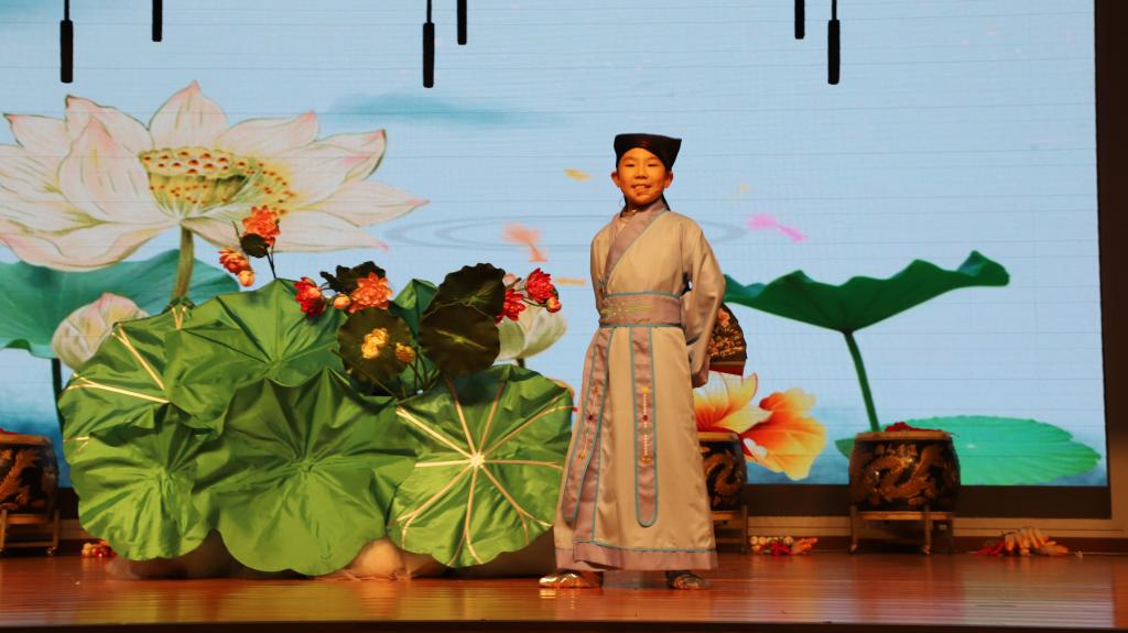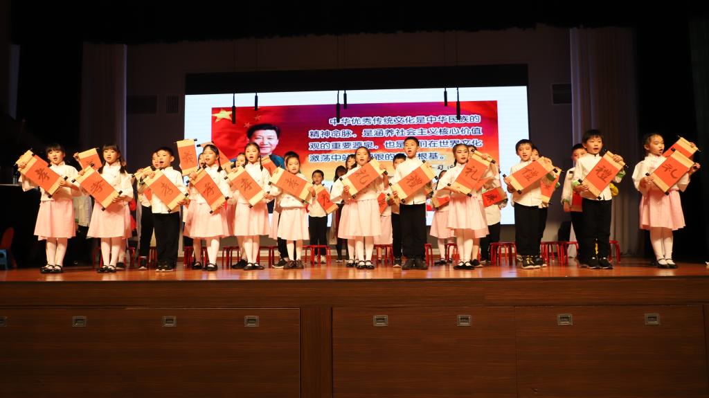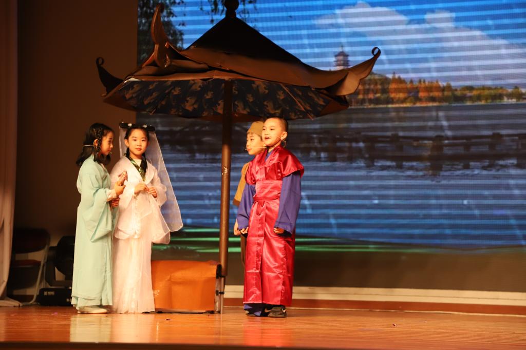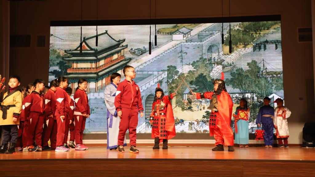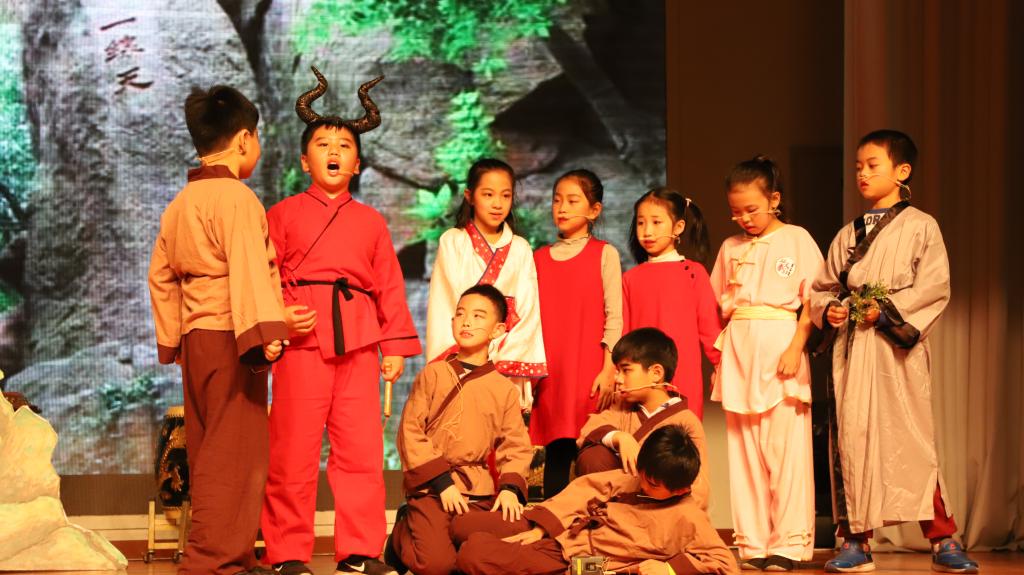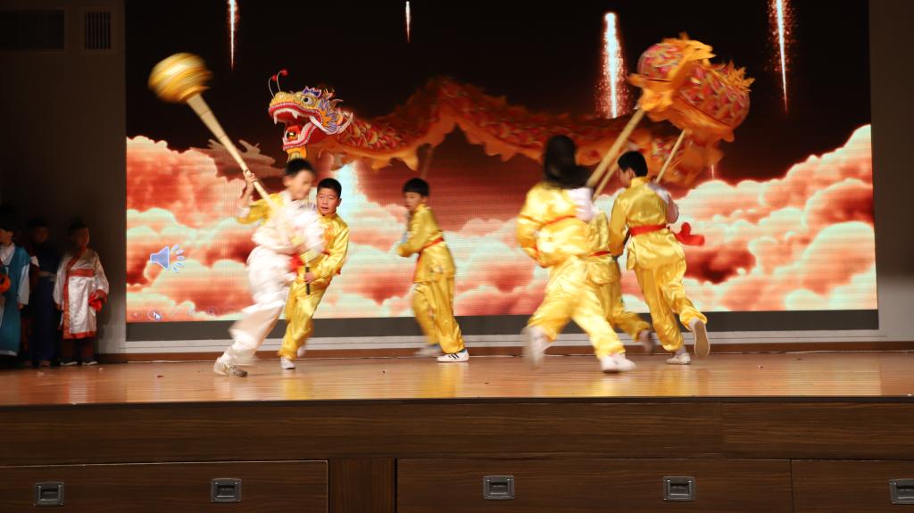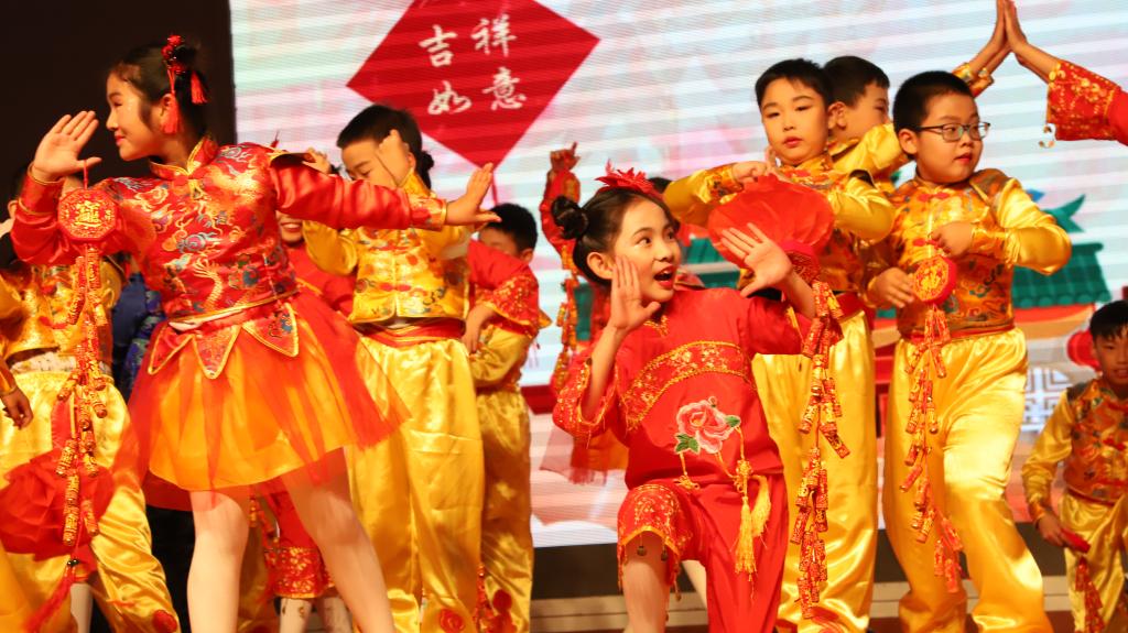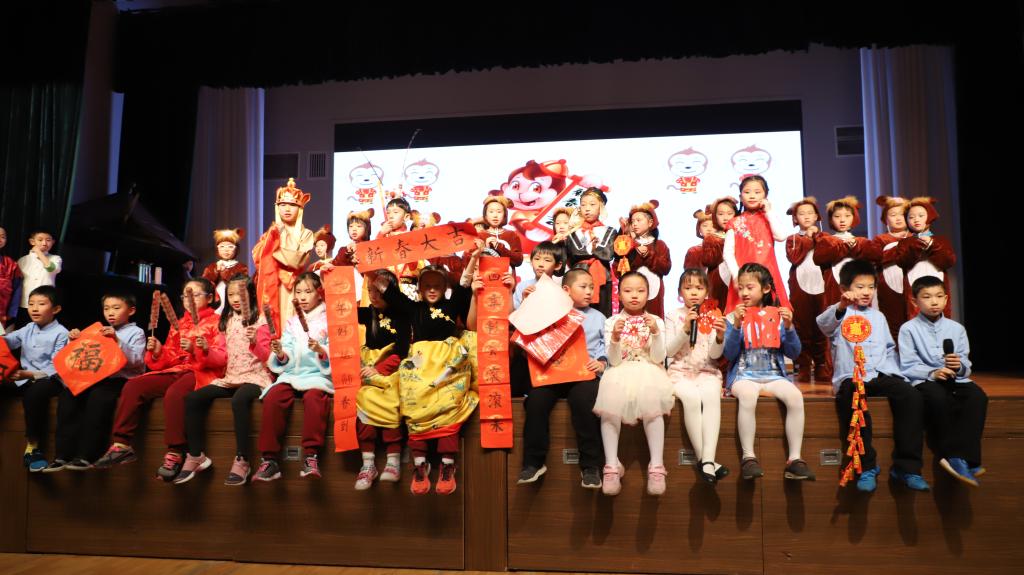 接下来,开场的节目是三(5)班以童话形式,穿越时空,由24节气魔棒指引。“巴拉巴拉的旅程”观看春花烂漫,夏荷婆娑,秋收的红火,冬藏的恬静。三(1)班,中医药学是中国古代科学的瑰宝,是打开中华文明的钥匙。让我们穿过时空的隧道,了解神农尝百草的故事。爆竹声中一岁除,春风送暖入屠苏。千门万户曈曈日,总把新桃换旧符。送福字,剪窗花,贴春联,放鞭炮。三(2)班的“过大年”红红火火。