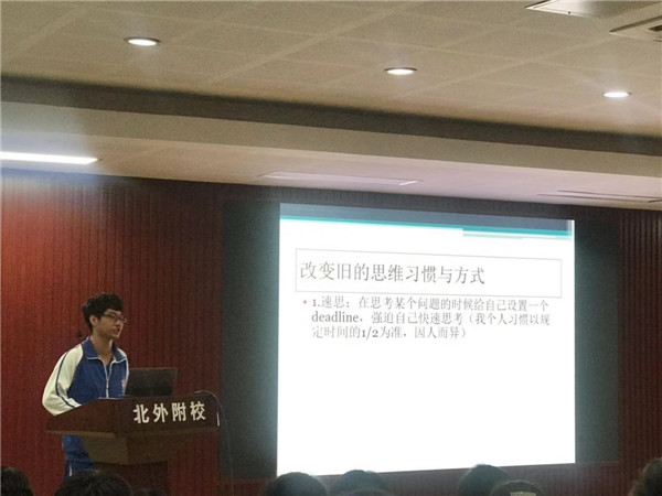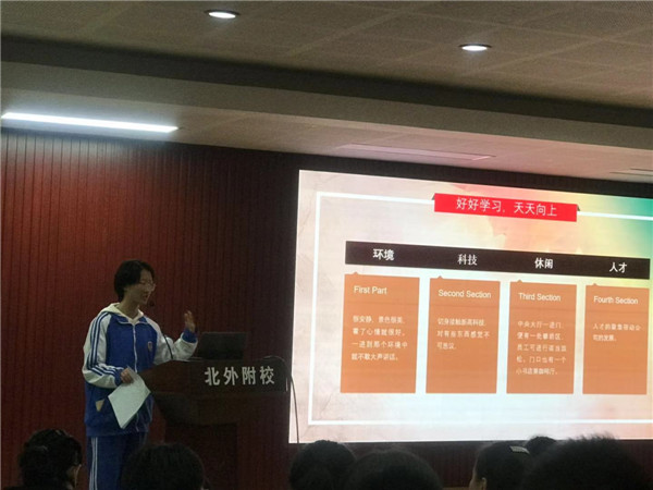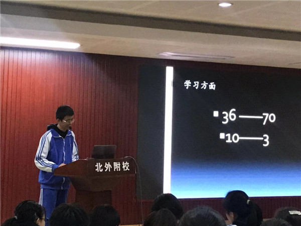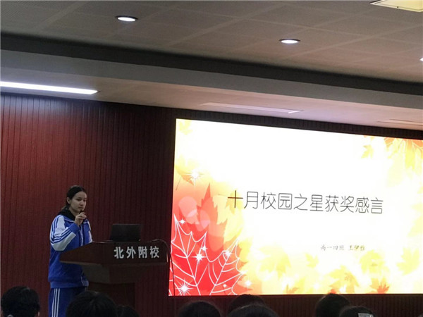 随后,由获得9、10月份“校园之星”荣誉称号的张瑾姝、陈阳、崔佳、王伊雅四位同学进行演讲,他们分别从学习、个人发展的角度进行了总结,给同学们带来学习及生活的启示。