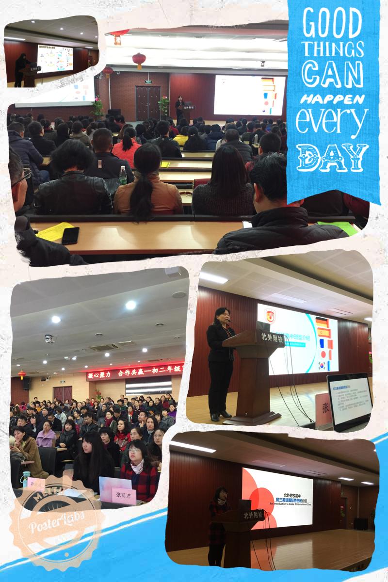 本次会议主要分为两部分。会议第一部分,王莉做了题为“凝心聚力,合作共赢”的发言。她介绍了本学期初二年级的工作重点和主要活动。并从学生成长、学习生活、英语听说机考、中考体育测试等方面为家长提出了建议和希望。其次,初中国际项目主任张丽君、初三国际班郭欣媛老师就初中国际项目和国际班学生学习情况做了具体介绍,着重强调了学习英语和规划学习的重要性。