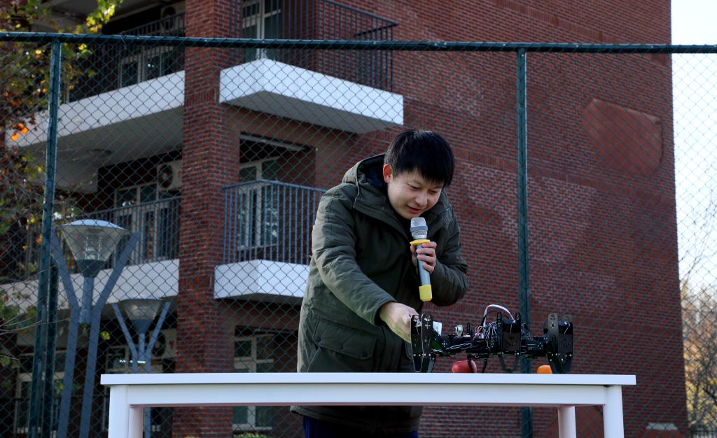 随着航空模型的完美着陆,孩子们发现主席台前多了一个大大的无人机——“蜘蛛侠”,孙校长用不同的食物在前面引导它,它会自动的向前爬行追寻着喜欢吃的东西,成功吸引到全场孩子们好奇的目光。