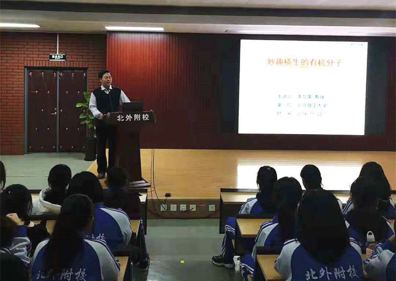 2018年11月22日下午第九节,我校有幸邀请北京理工大学李加荣教授来我校为高一高二全体同学带来一场有关有机化学分子的科普讲座。讲座共分为“卖萌”有机分子、象形有机分子等四个模块,为同学们全面介绍了化学分子怎样学习和识记,使原来在课本上略显枯燥的化学分子都变得生动有趣起来,吸引了学生们的学习兴趣和热情,整个讲座过程中都充满了浓烈的学习氛围。