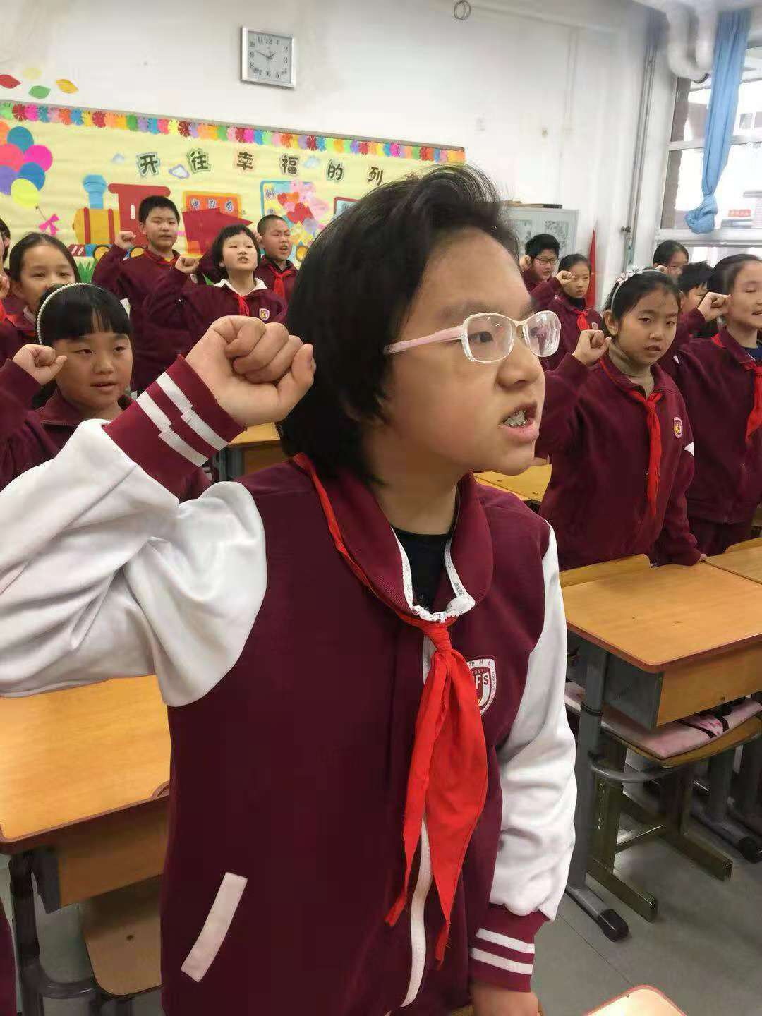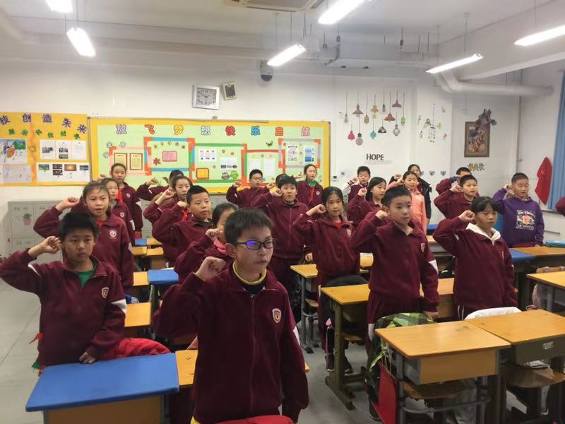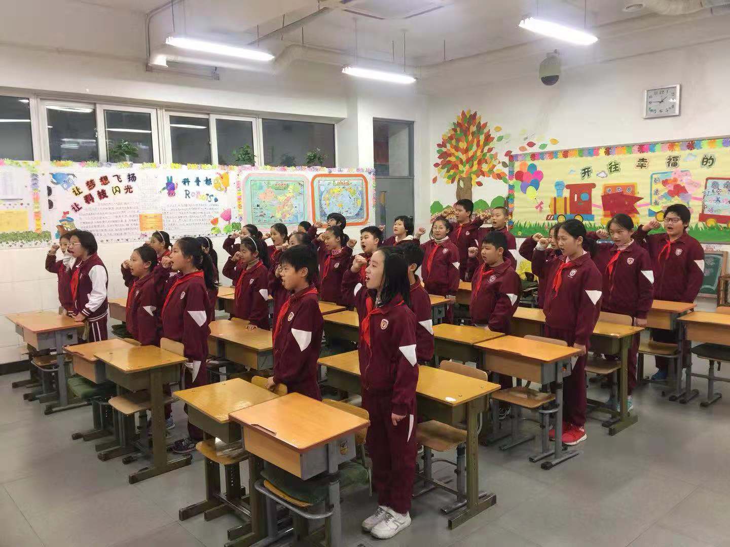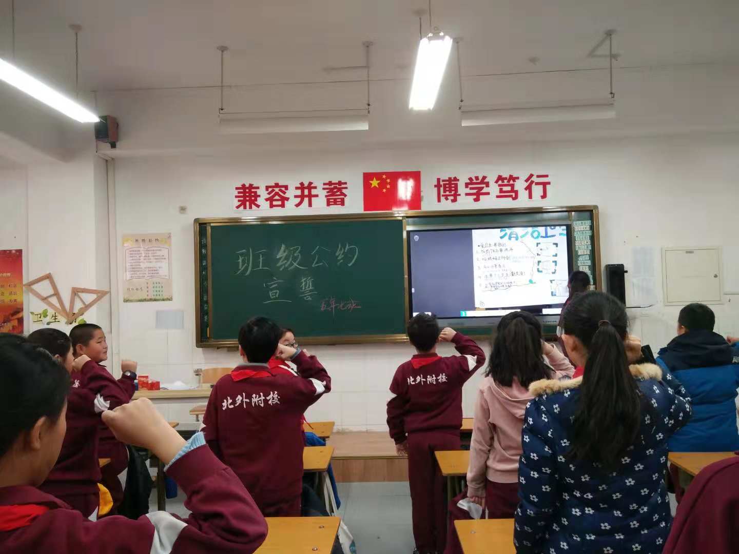 今天北外附校小学五年级在下午第一节少先队活动课上,进行了班级公约的宣誓。