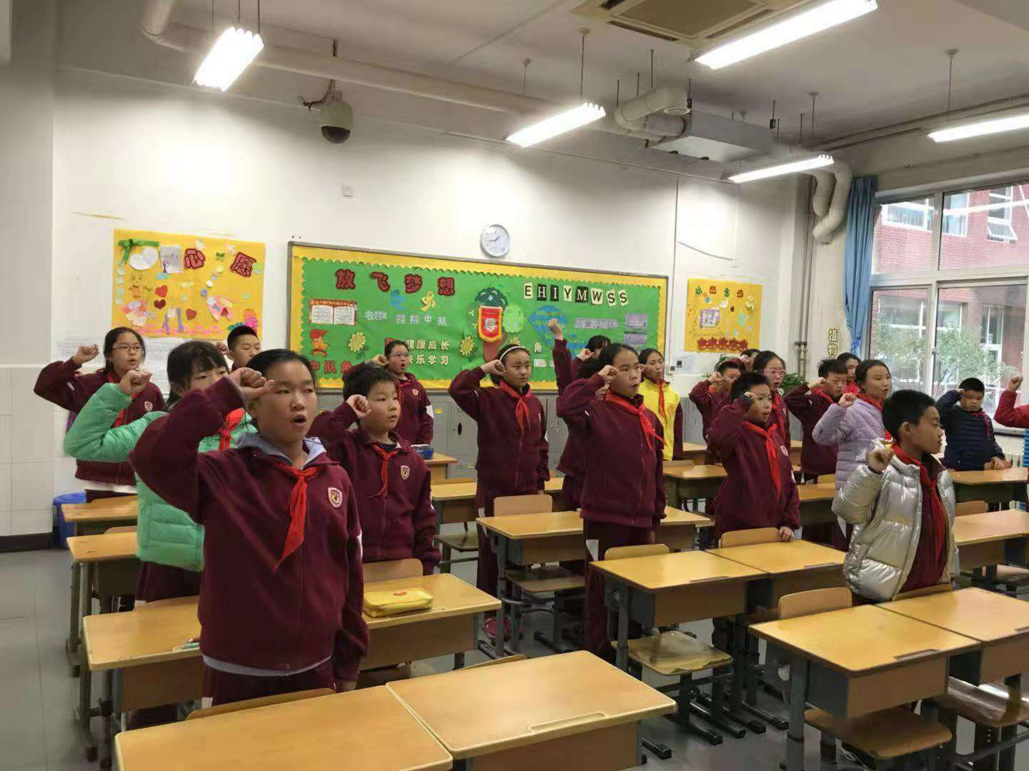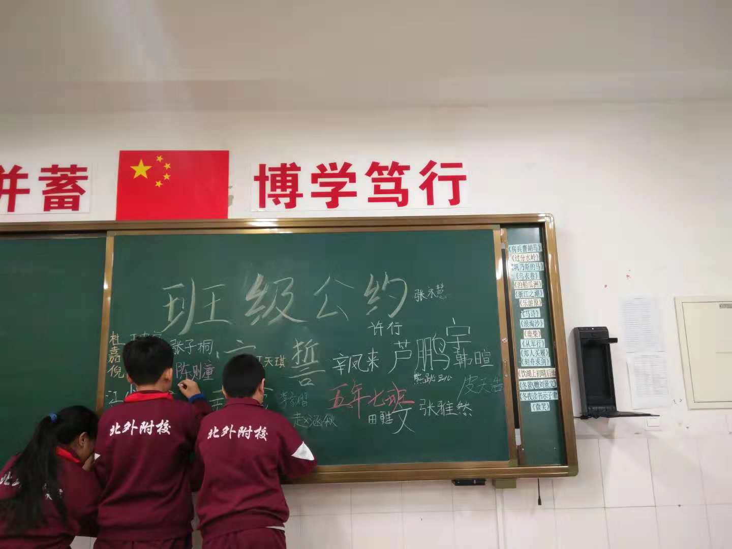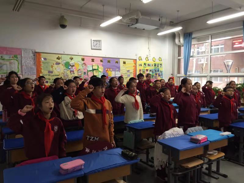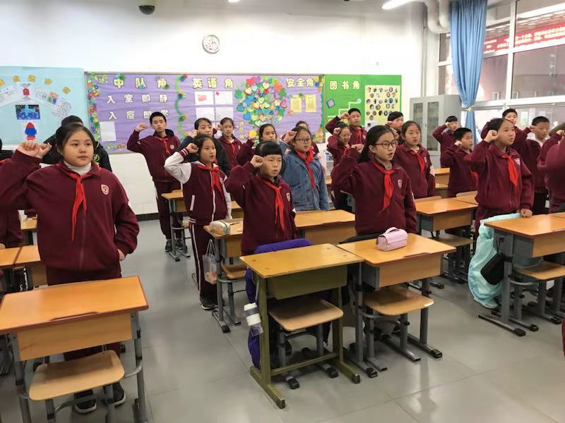 今天北外附校小学五年级在下午第一节少先队活动课上,进行了班级公约的宣誓。