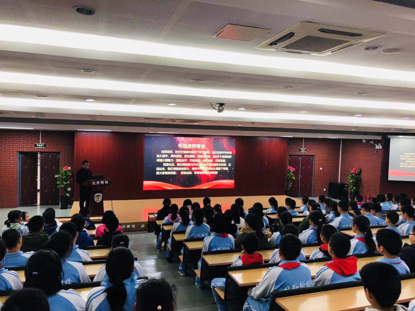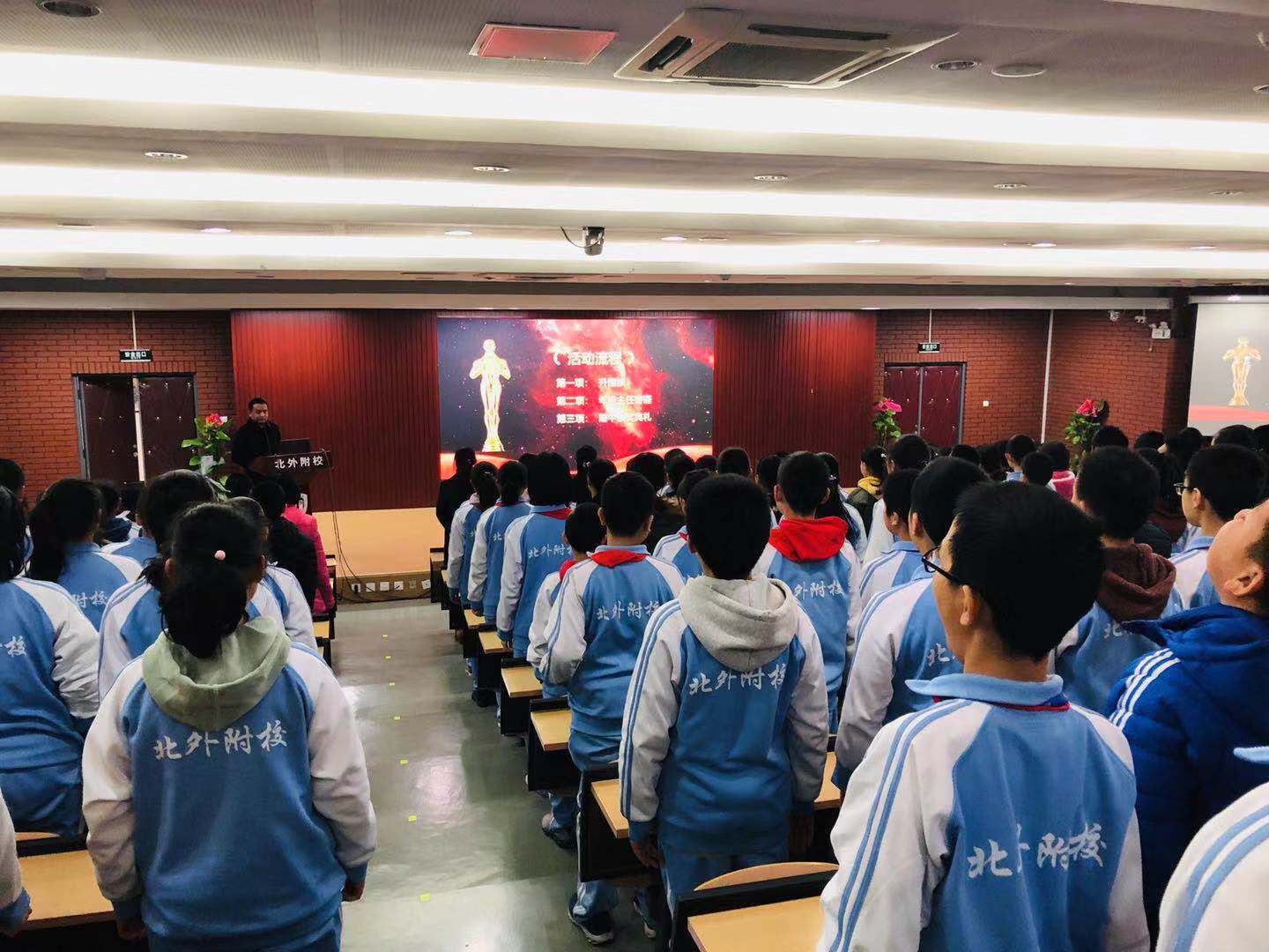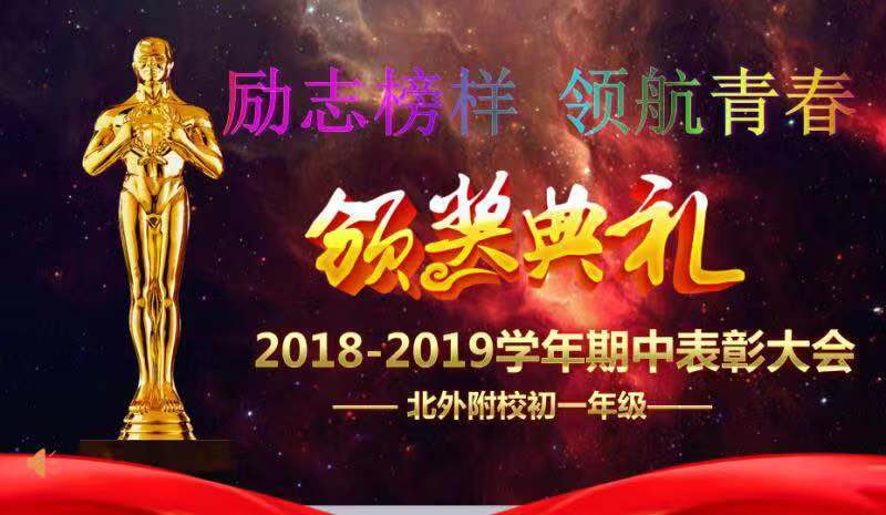 表彰大会在师生嘹亮的国歌声中拉开帷幕。半个学期来,我校2018级初一年级的全体师生们取得了优异的成绩,涌现出大批学习刻苦、成绩突出、进步较大的先进个人和优秀班集体。大会表彰了“北外附校校园之星”、“最美学霸奖”、“学习楷模”、“单科学习标兵”、“班级之星”等荣誉。年级部主任李保申老师在表彰大会上对全体学生寄语,希望全体学生以这次表彰大会为契机,树榜样、学先进,创佳绩。只有正视自己的问题,明确前进目标,积极付出行动,坚持不懈努力,才能在成长道路上体会到更多的幸福感和获得感。