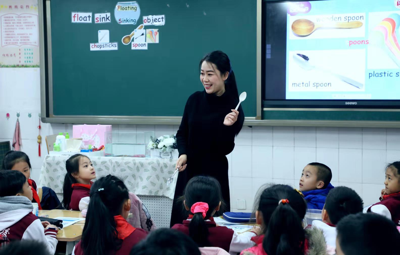 英语教师李文霞带来了主题为“What floats? What sinks?”的一节示范课,通过巧设问题引出沉浮主题,带领学生探究不同物体和材料的沉浮。学生通过科学预测、实验验证,掌握了检验物体沉浮的科学方法,自然习得了float和sink两个核心科学词汇,能够熟练、自信地用英文描述物体的沉浮。