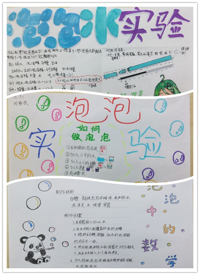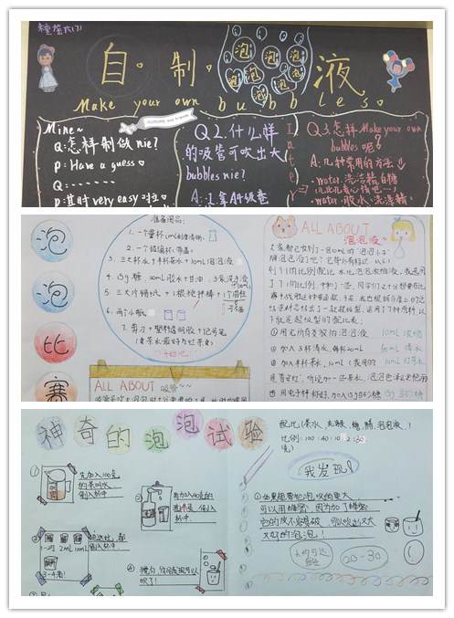 最后,同学们通过小报的形式,与大家分享了制作中的“特殊添加剂”— —茶水、甘油、蜂蜜、醋、糖、色素等物品会让泡泡液产生怎样的变化。