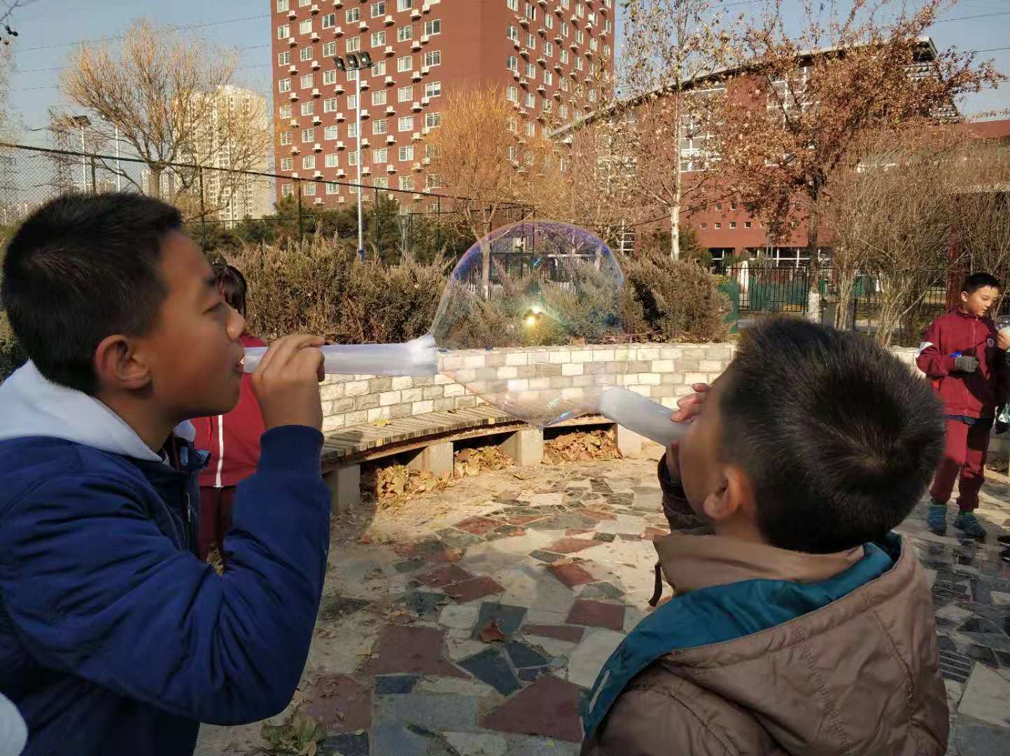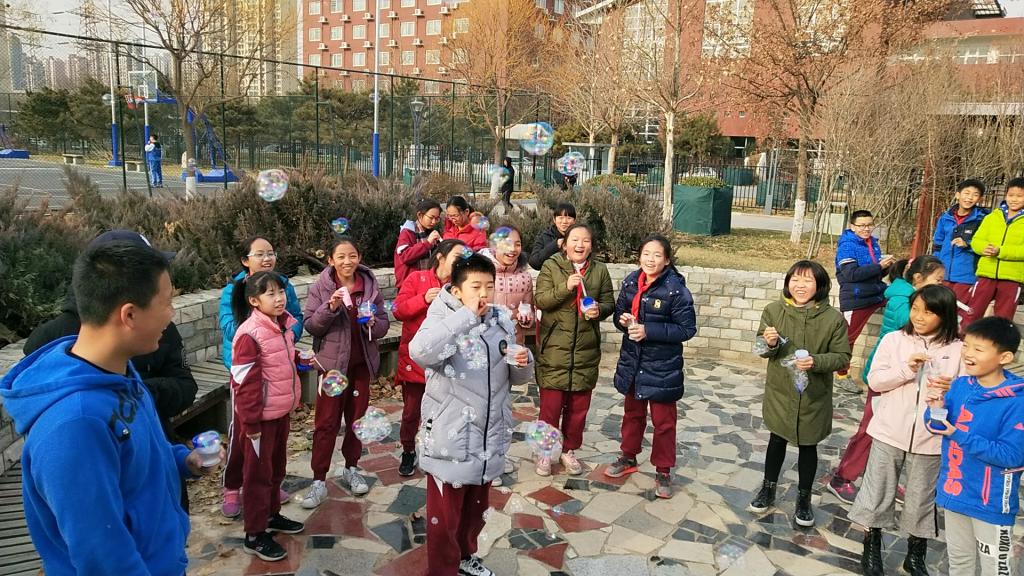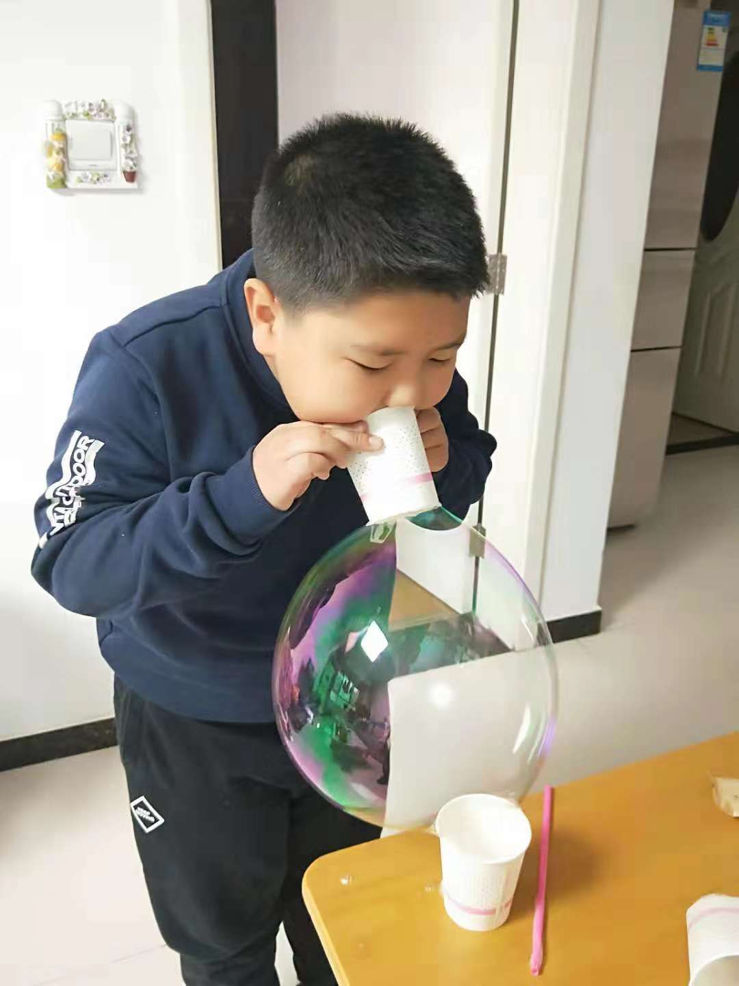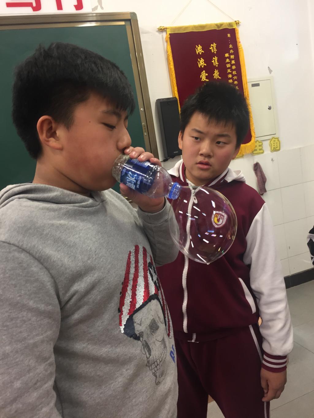 活动中,学生们脑洞大开,用吸管、胶条圈、卷纸芯、塑料纸、铁丝、小喇叭等身边小物件,制作了各种各样的“吹泡泡神器”,大家兴致高昂地比谁吹得多,或比谁吹得大。学生通过独立尝试、动手操作,制作了自己的“专属泡泡液”。之后在课上与伙伴分享“配方”,经过提问、对比和探讨,大家发现,使用每种物品间的“比例关系”比“具体数量”更好。根据配比关系,可以配出质量不同,但浓度相同的“泡泡液”,还可以同时配置供一个人或多个人使用的“泡泡液”,当然,也可以投入工厂,进行大批量生产。