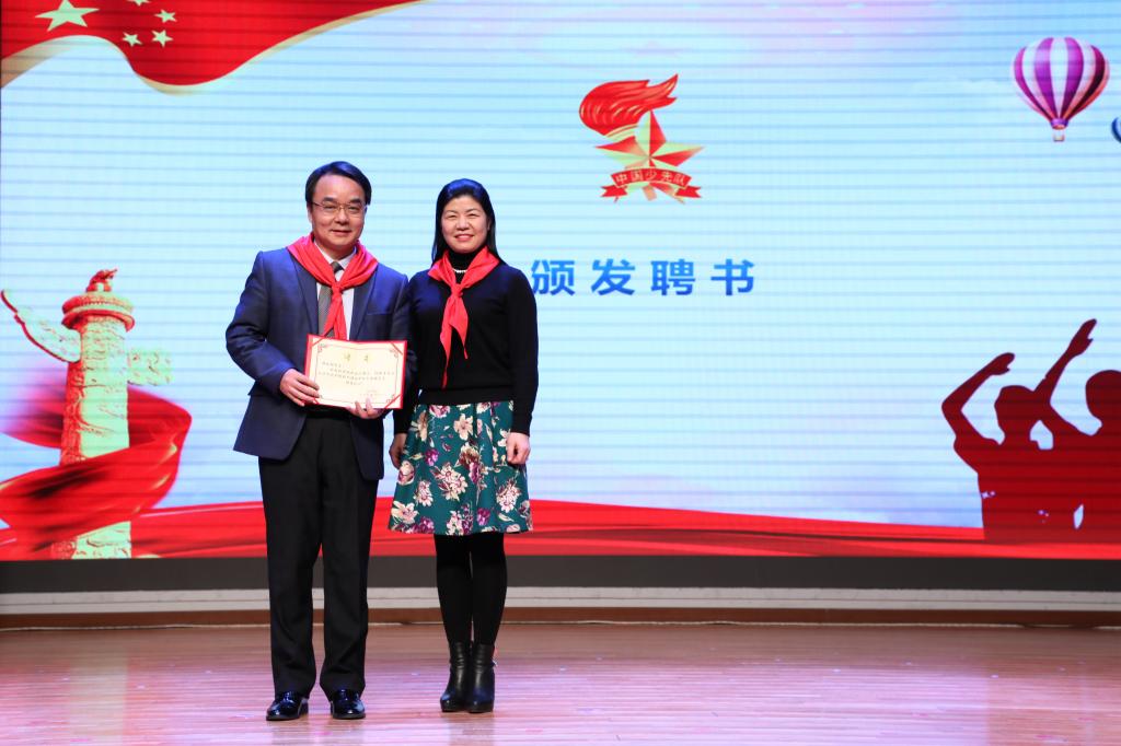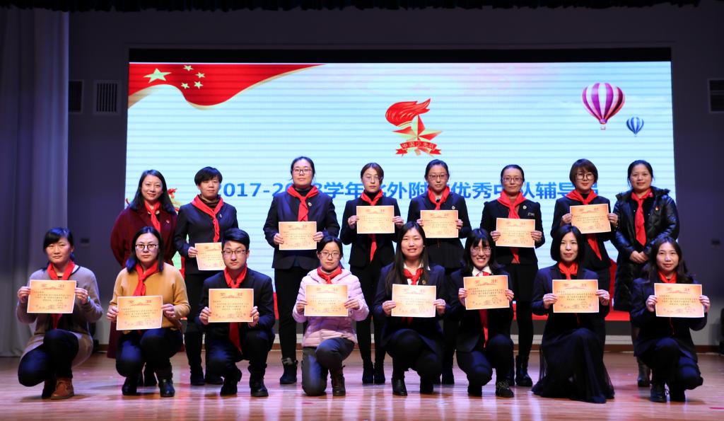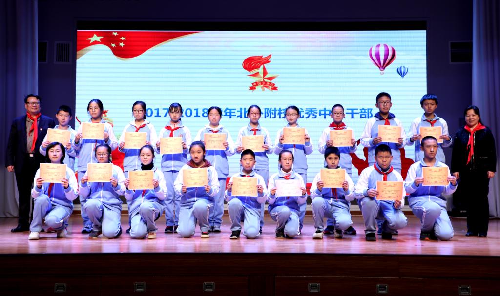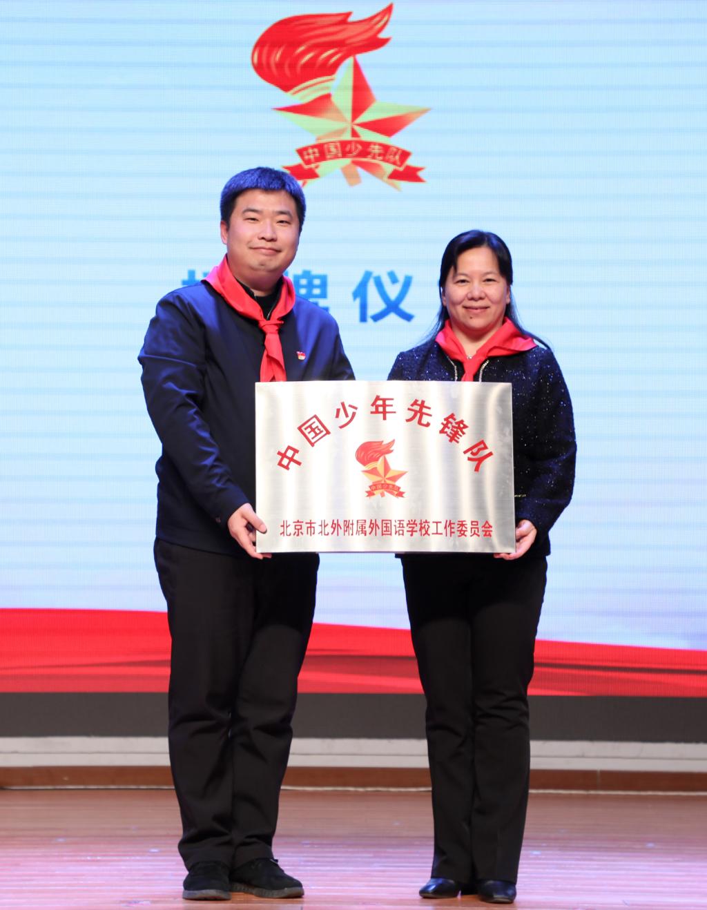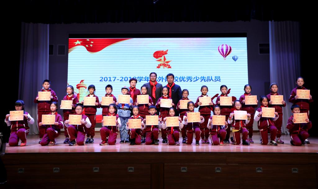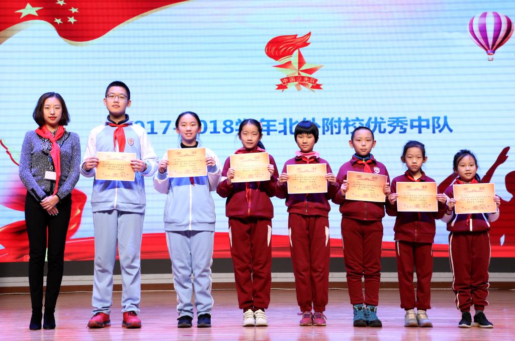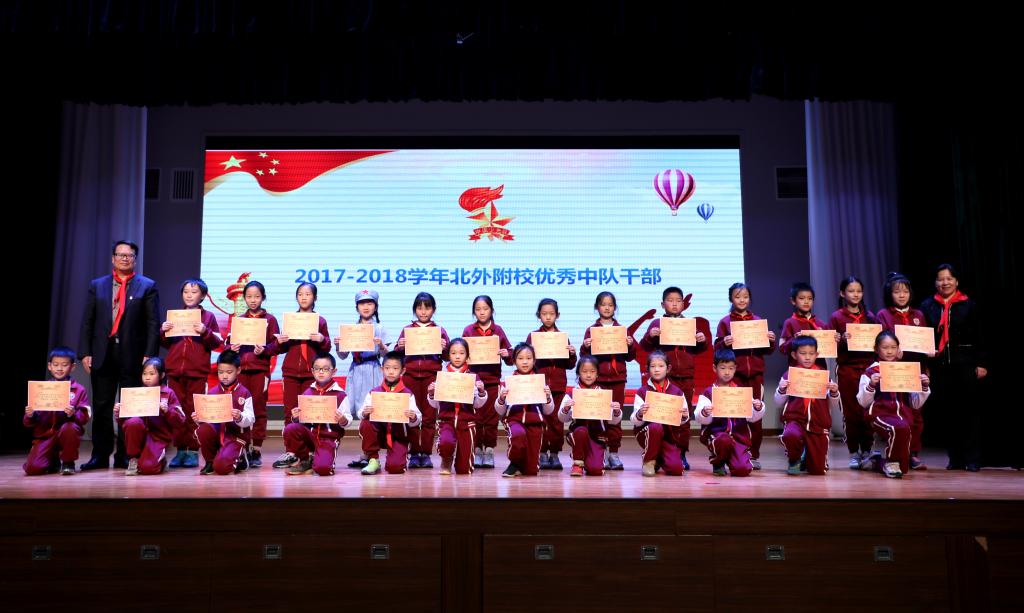 最后,会议表彰了2017-2018学年68名优秀少先队员代表、68名优秀中队干部代表、七个优秀中队、14名优秀中队辅导员,并为他们颁发奖状。会议还聘请北京农学院科技处处长蒋林树为我校志愿辅导员。海淀区少工委办公室主任章军宣读《关于申请成立中国少年先锋队北京市北外附属外国语学校工作委员会的批复》并为我校授牌。