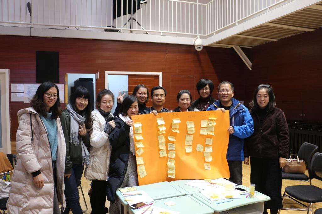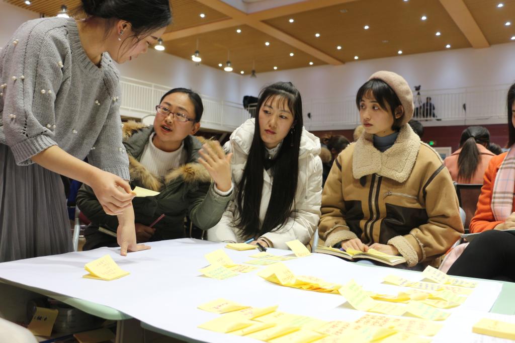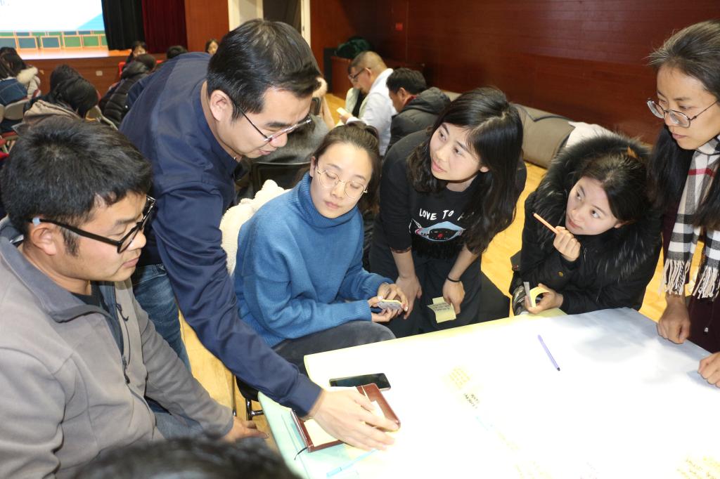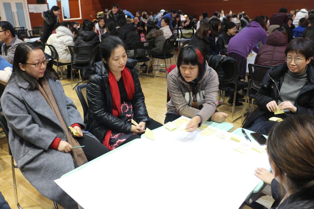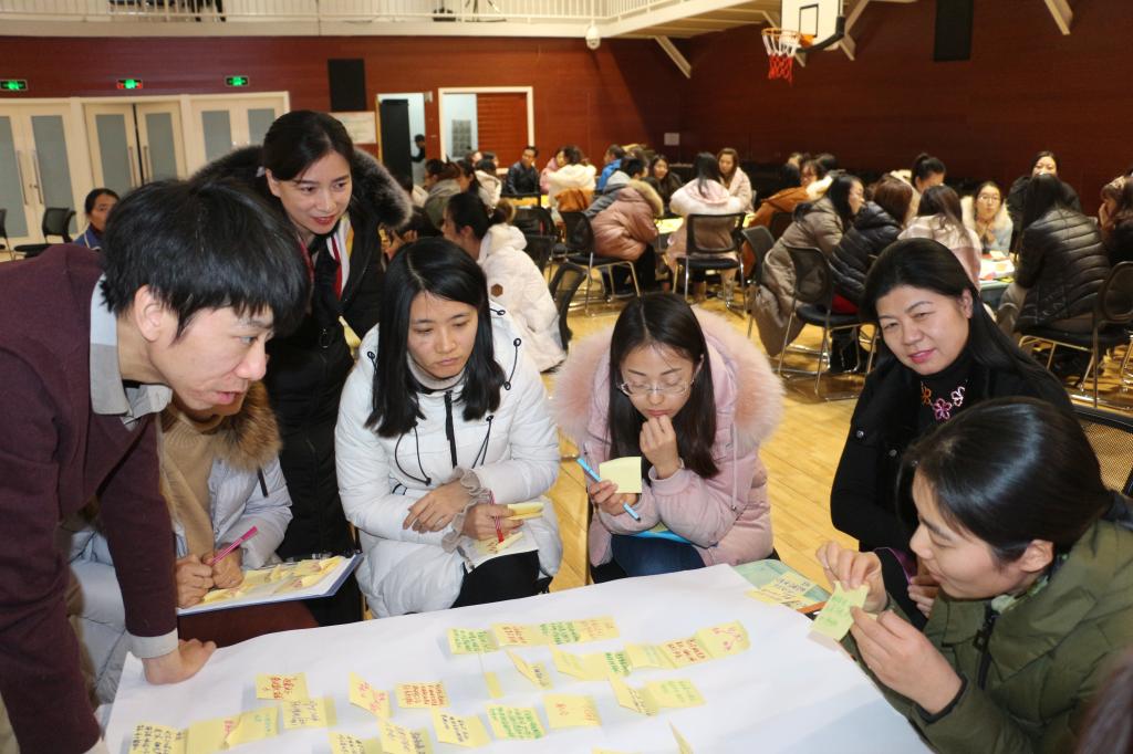 如何开展家校合作,发挥家校共育的作用呢?范宸驿老师在培训中采用了“行动学习法”。研讨的话题有三个:如何创建校级、年级、班级家委会,如何开展家长进课堂,如何发挥好家委会的作用。在范宸驿的指导下,老师们分为16组,每位老师在独立思考后写下自己的观点,并和小组成员一起对观点进行分组归类,设定标题。半个多小时的头脑风暴之后,17个小组呈现出了一个个独特新颖的标题、一组组富有逻辑的做法——《引“郎”入室,家长进课堂的七大策略》、《Enjoy Class Enjoy Life—Four Steps of Parents’》、《家校同心,助孩成金—创建三级家委会的四大途径》、《群龙有“首”,家长C位进阶法》、《共创“家”绩—创建三级家委会四部曲》、《爱之桥—从心沟通的四大途径》。这些题目彰显了老师们的教育智慧和经验,还富有学科特点。两个半小时的培训似乎转瞬即逝,老师们意犹未尽。