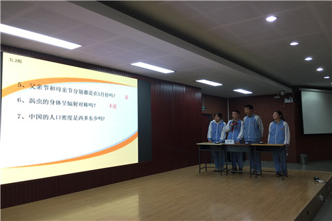 随着第三个环节的来临,比赛进入了白热化阶段,把全场的气氛推向了高潮。这一环节是限时的,而且要判断信息的对错。这非常考验学生对知识掌握是否牢固和他们在紧急情况下逻辑推理能力。在全场紧张的氛围中有些选手冷静而迅速地作出了正确决断。但也有些选手因为心太急或是没把握好时间而丢了分。