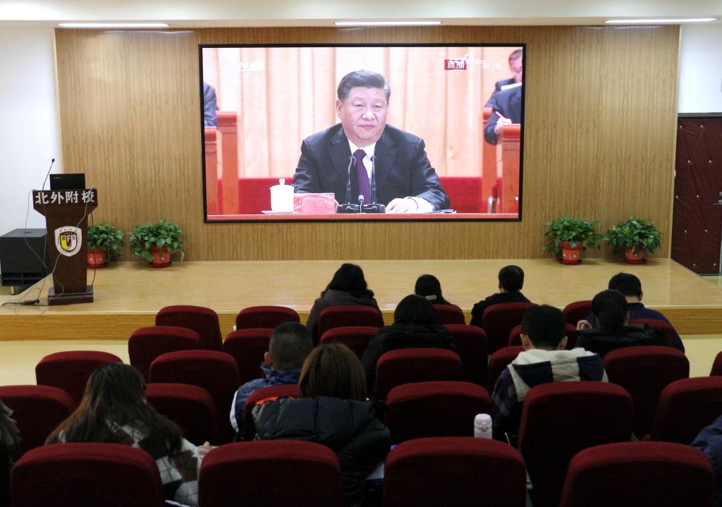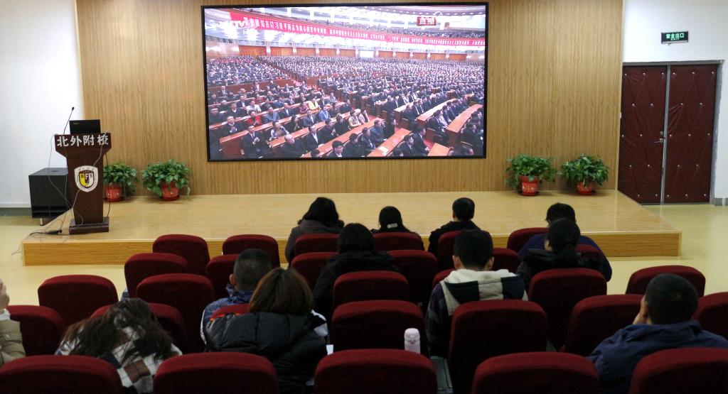 2018年12月18日上午10时整,我校组织教师在一阶报告厅收看“庆祝改革开放40周年”大会现场直播。党总支书记张继军、副校长高雁鸣、于苒到会收看。